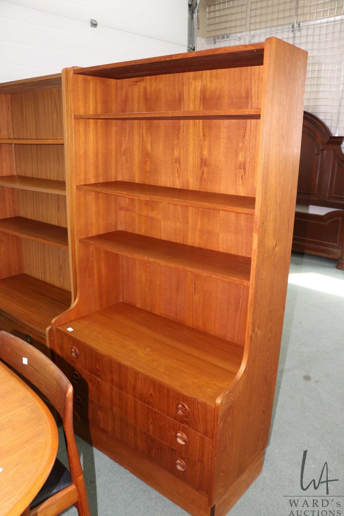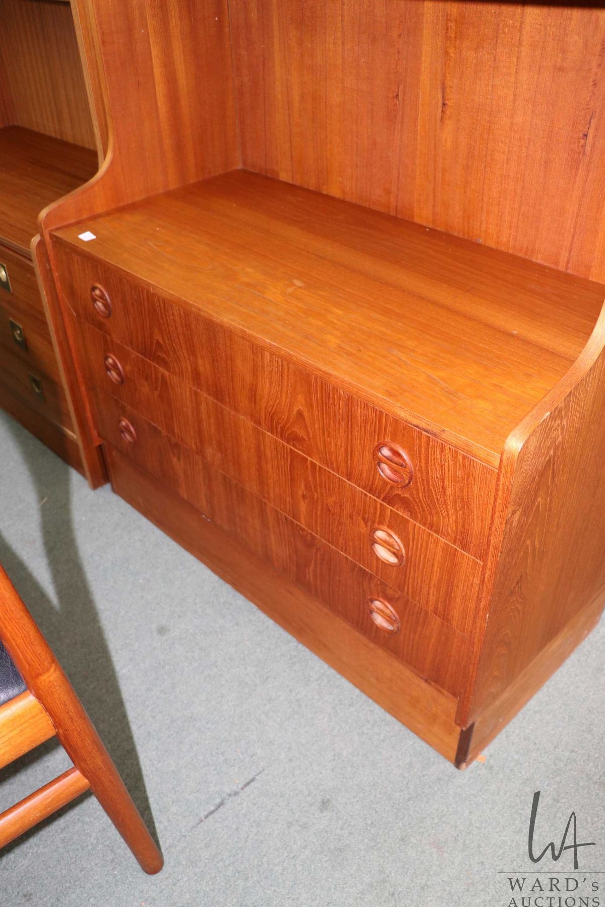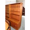 Mid century modern wall unit with three open shelves and three drawer base, 65" H X 35" W X 16" D