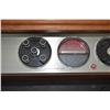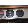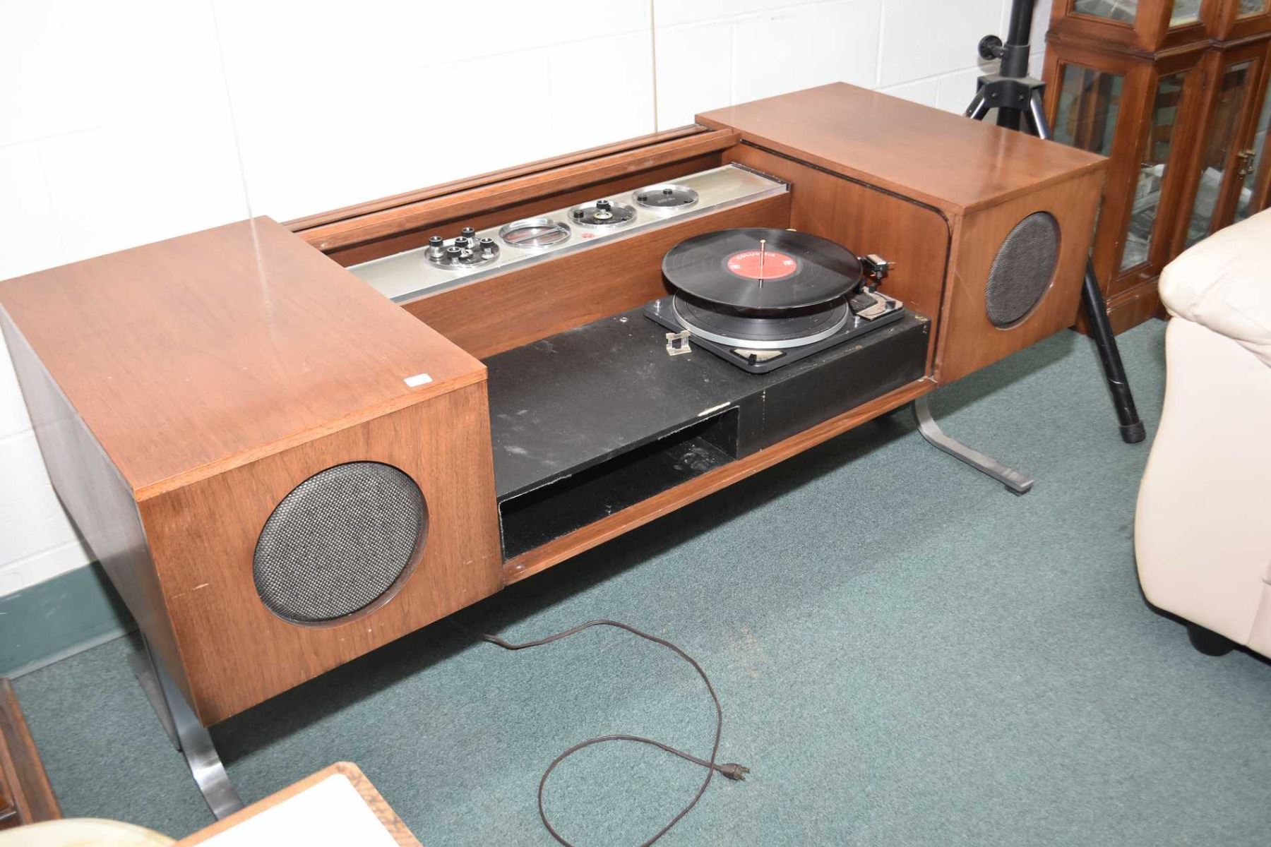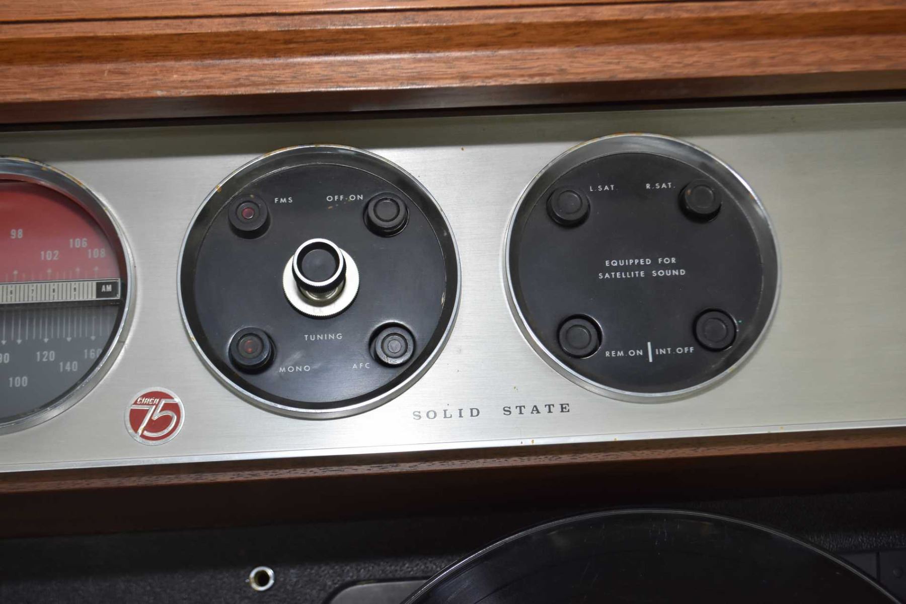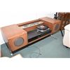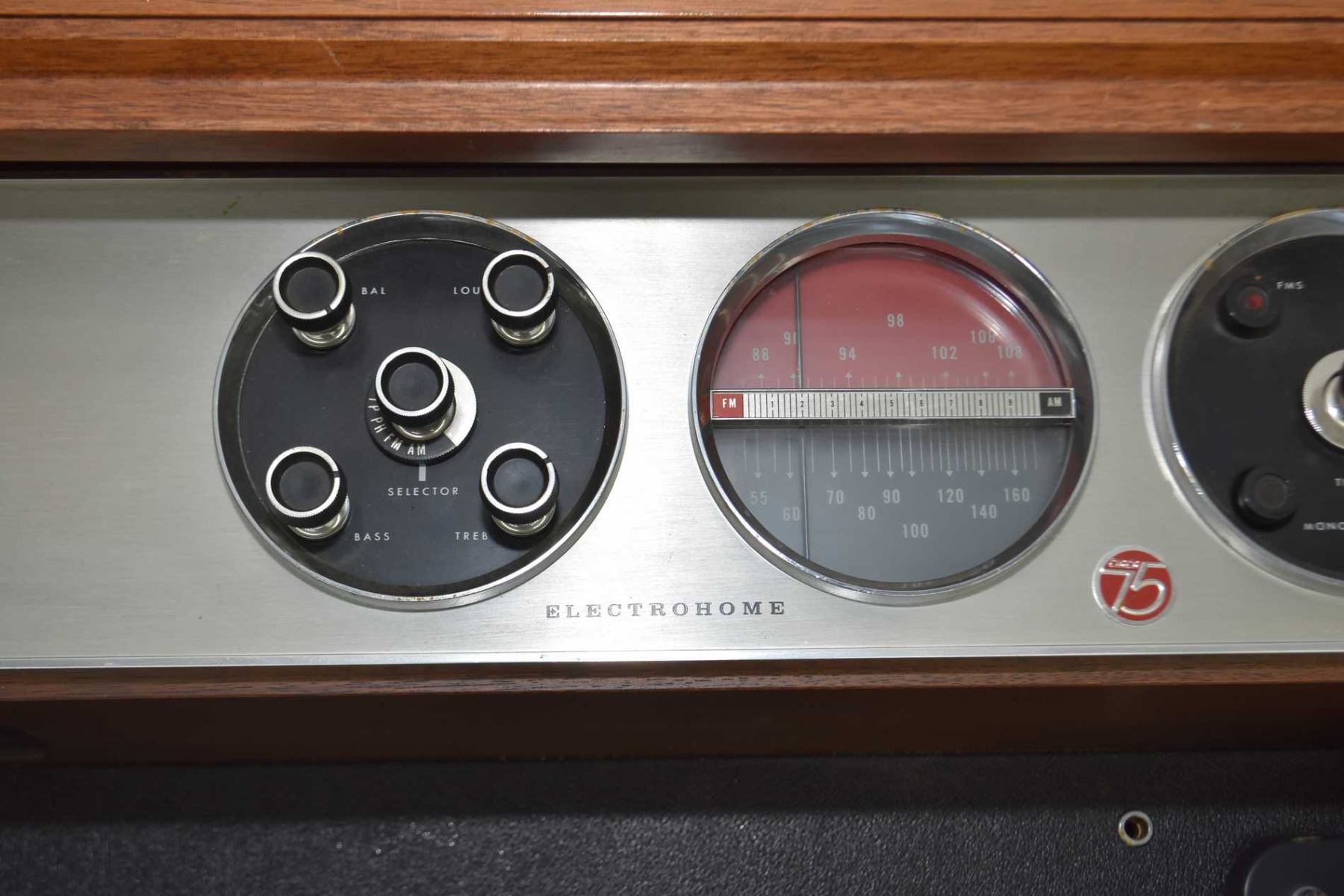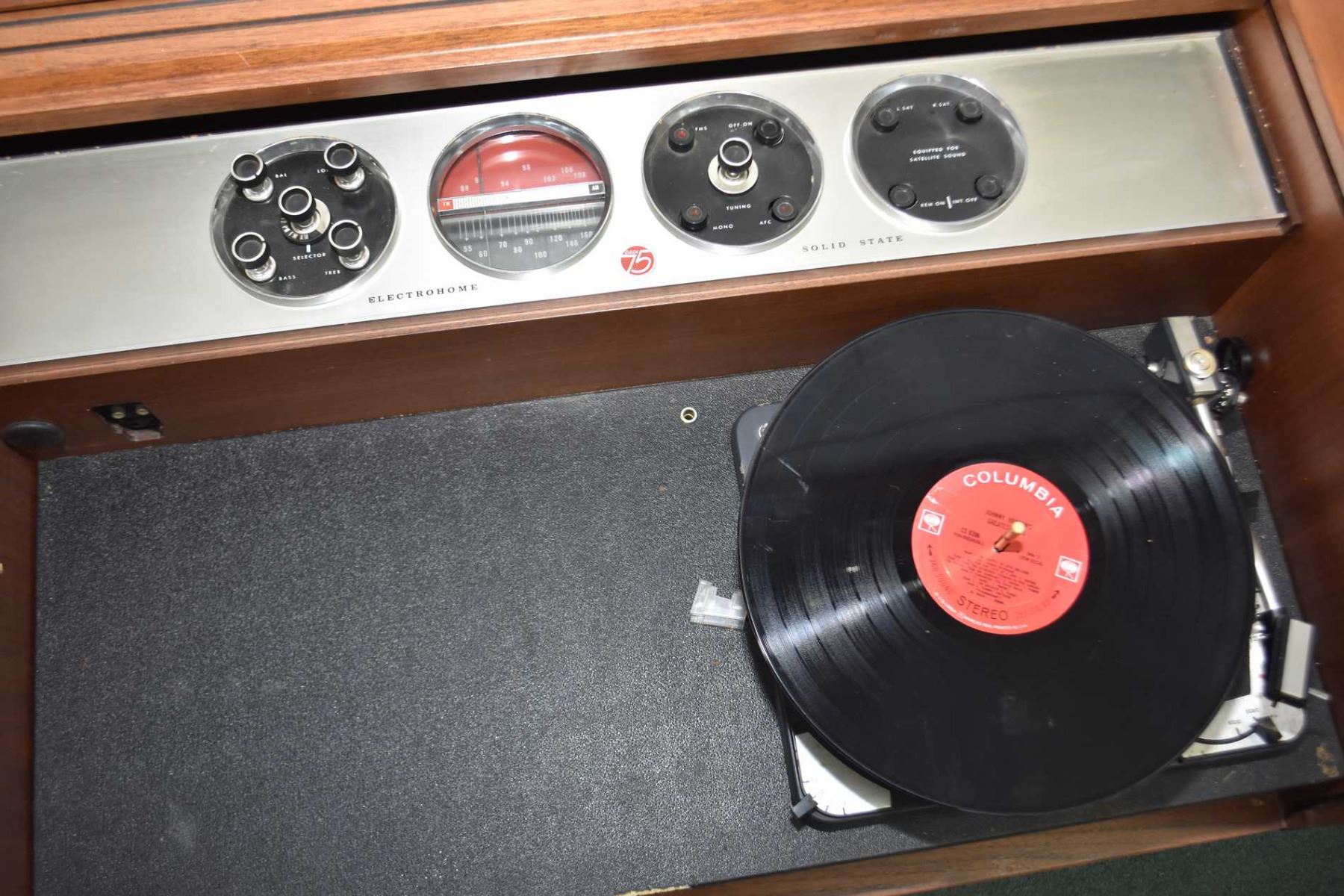 Mid century modern walnut cabinet with center roll top exposing Electrohome Solid State stereo with AM/FM receiver, input jacks and turn table