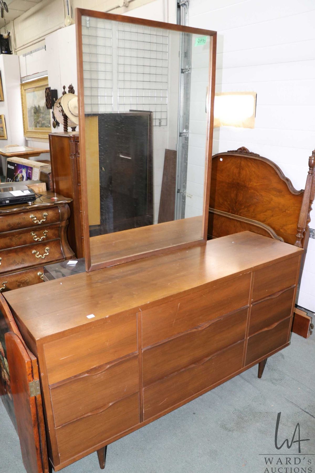 Mid century modern walnut mirrored six drawer dresser, 31" H X 59" W X 17" D, plus mirror
