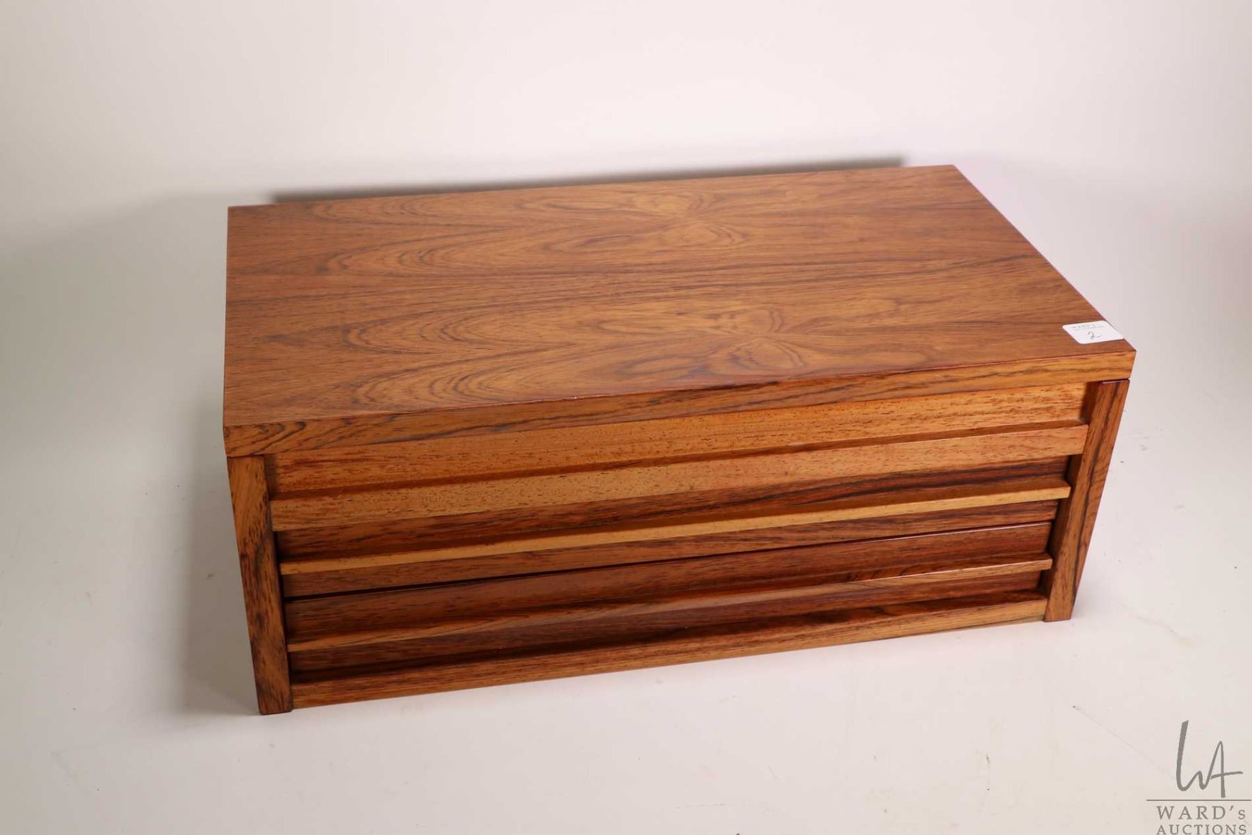 Mid century solid wood two drawer jewellery dresser box with flip up lid, flocked interior with ring and necklace storage etc.
