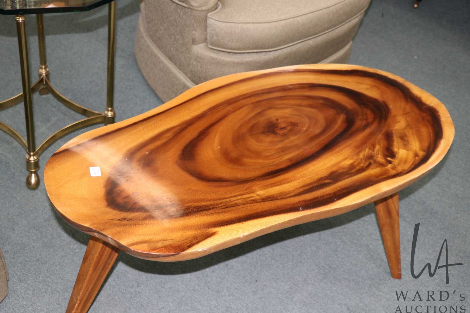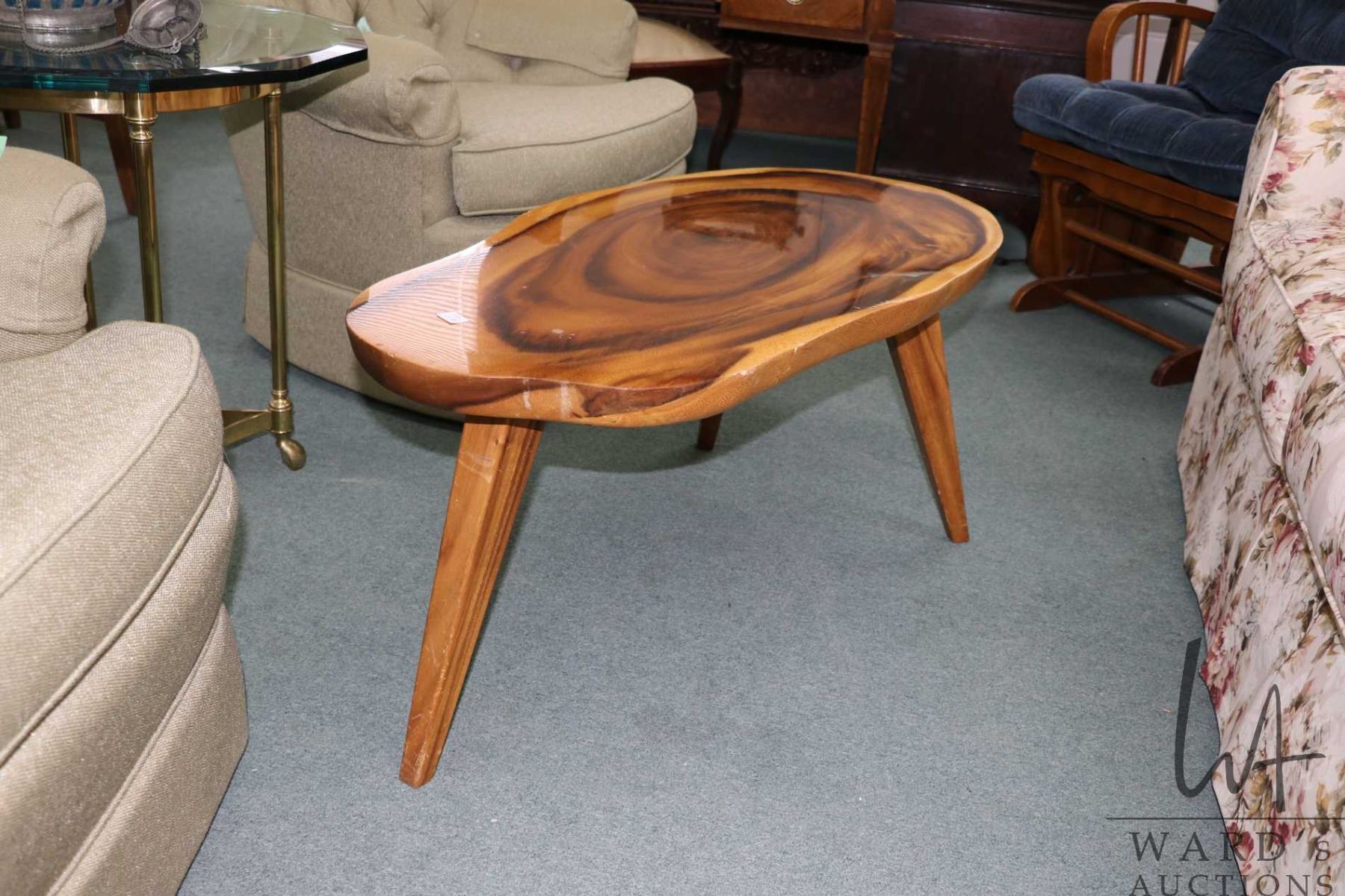 Mid century style live edge coffee table on three tapered leg, 17" H X 37" X 18"