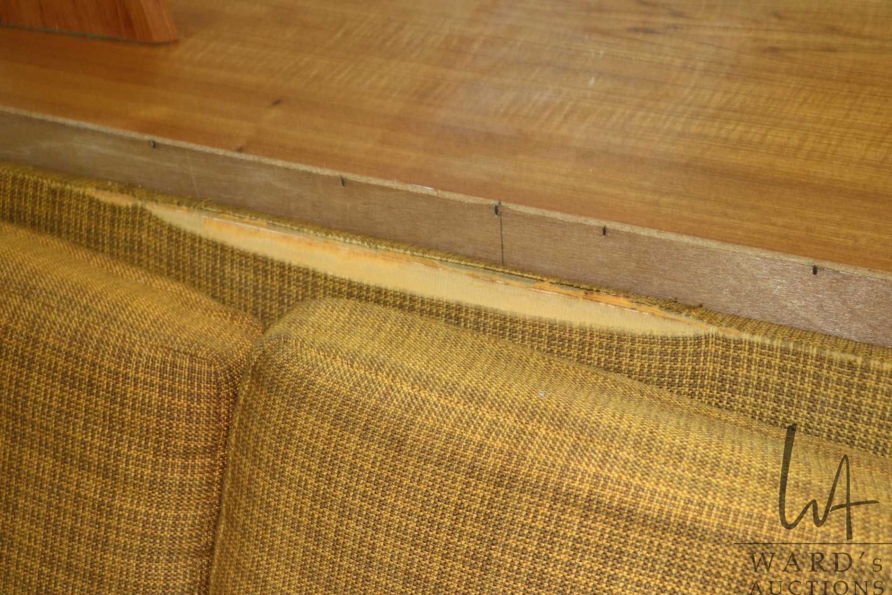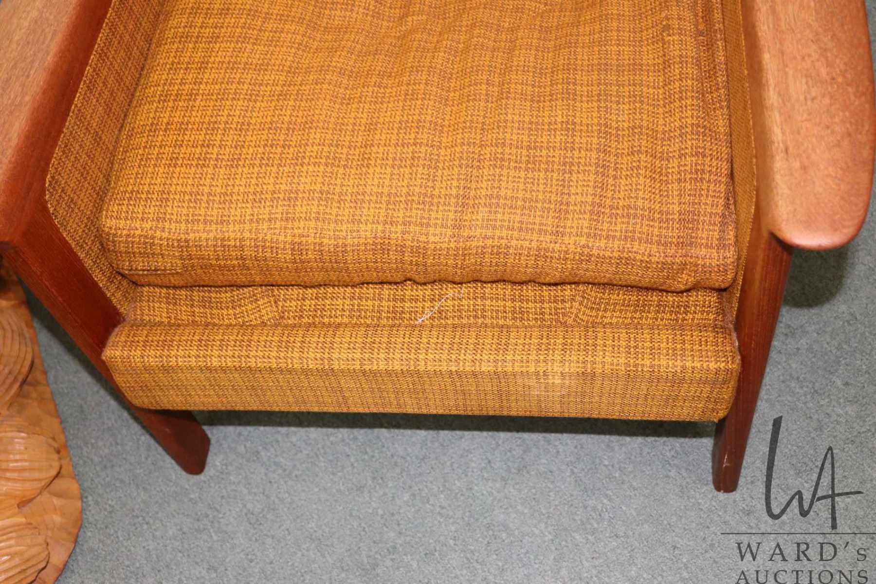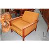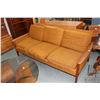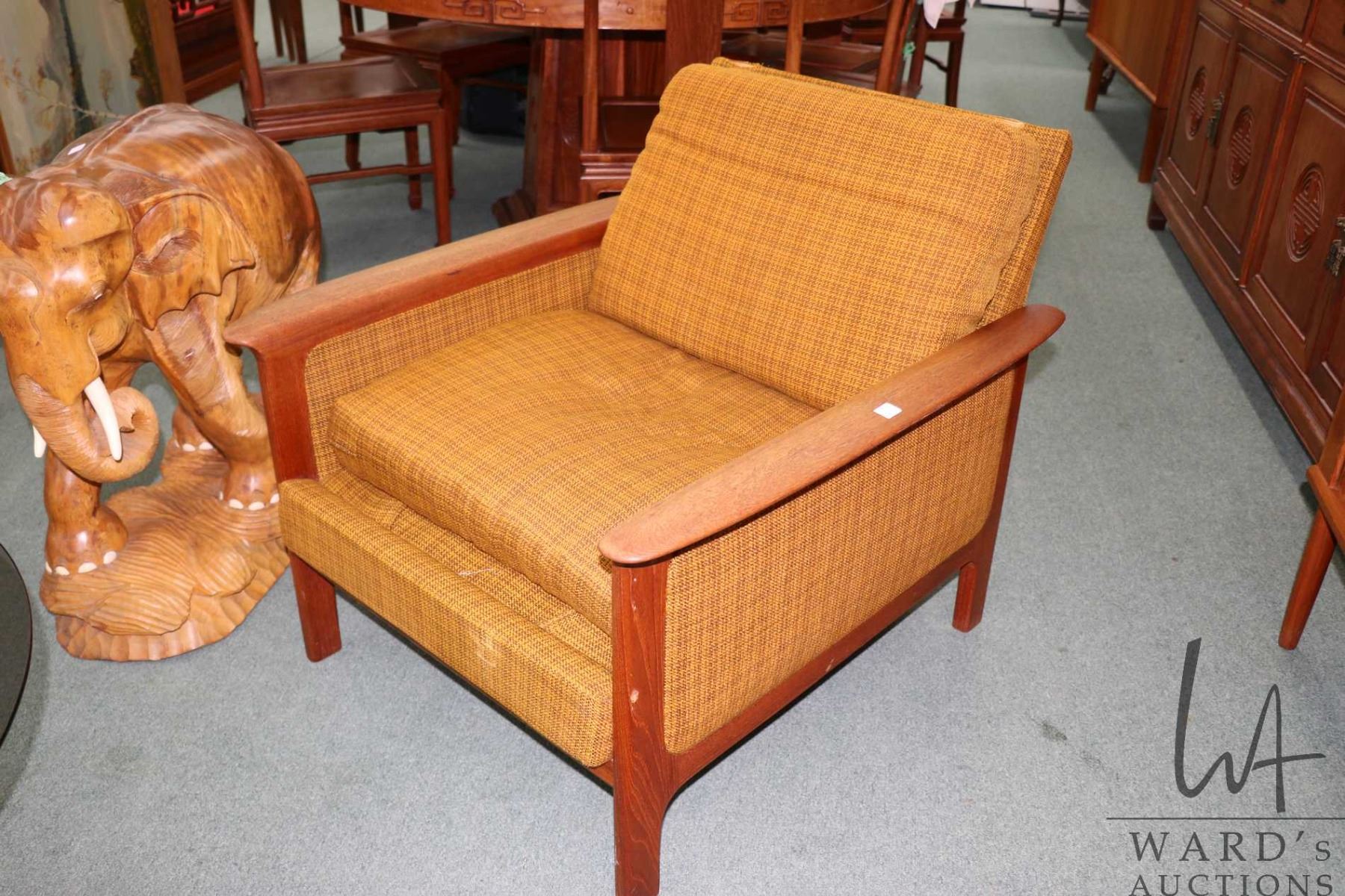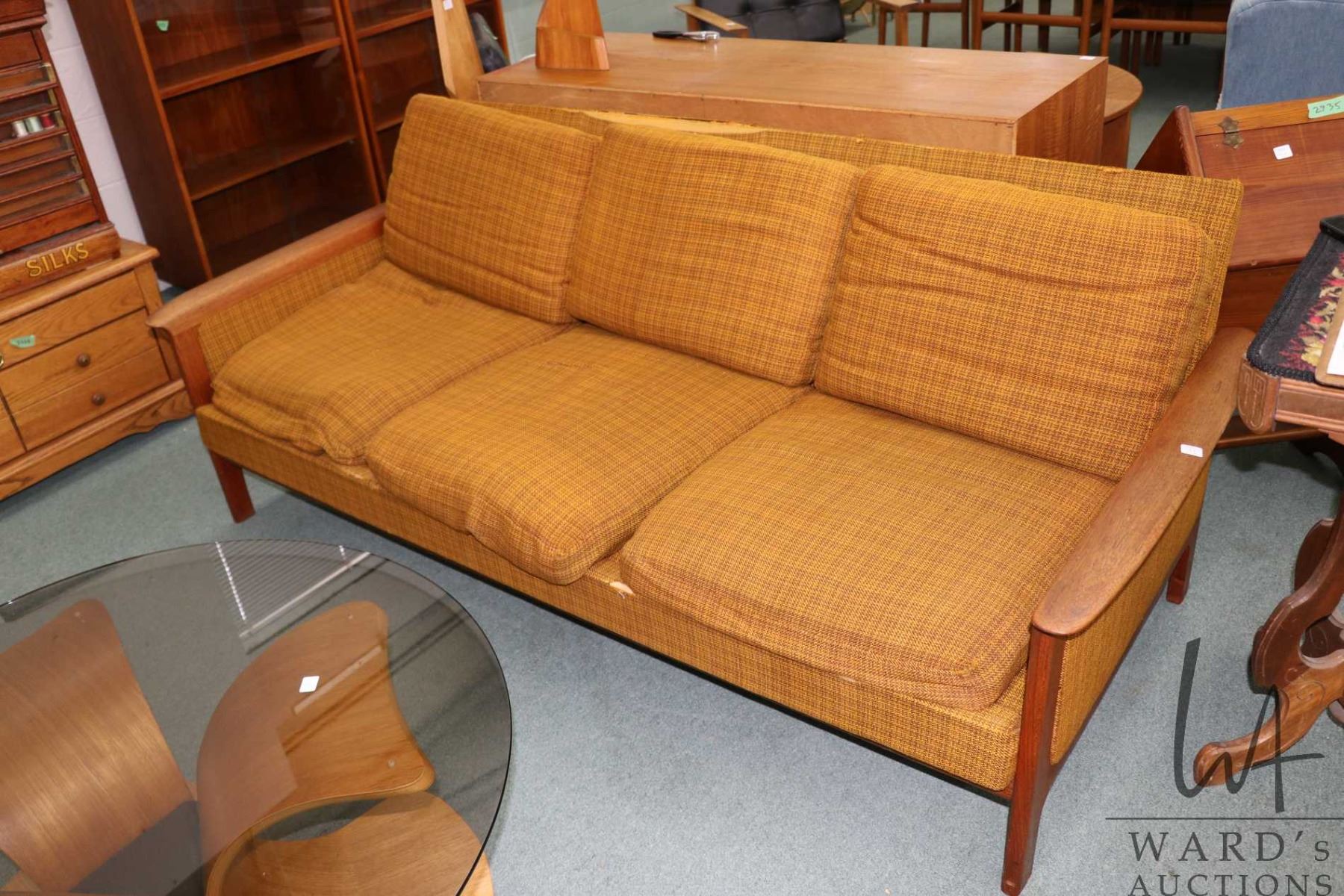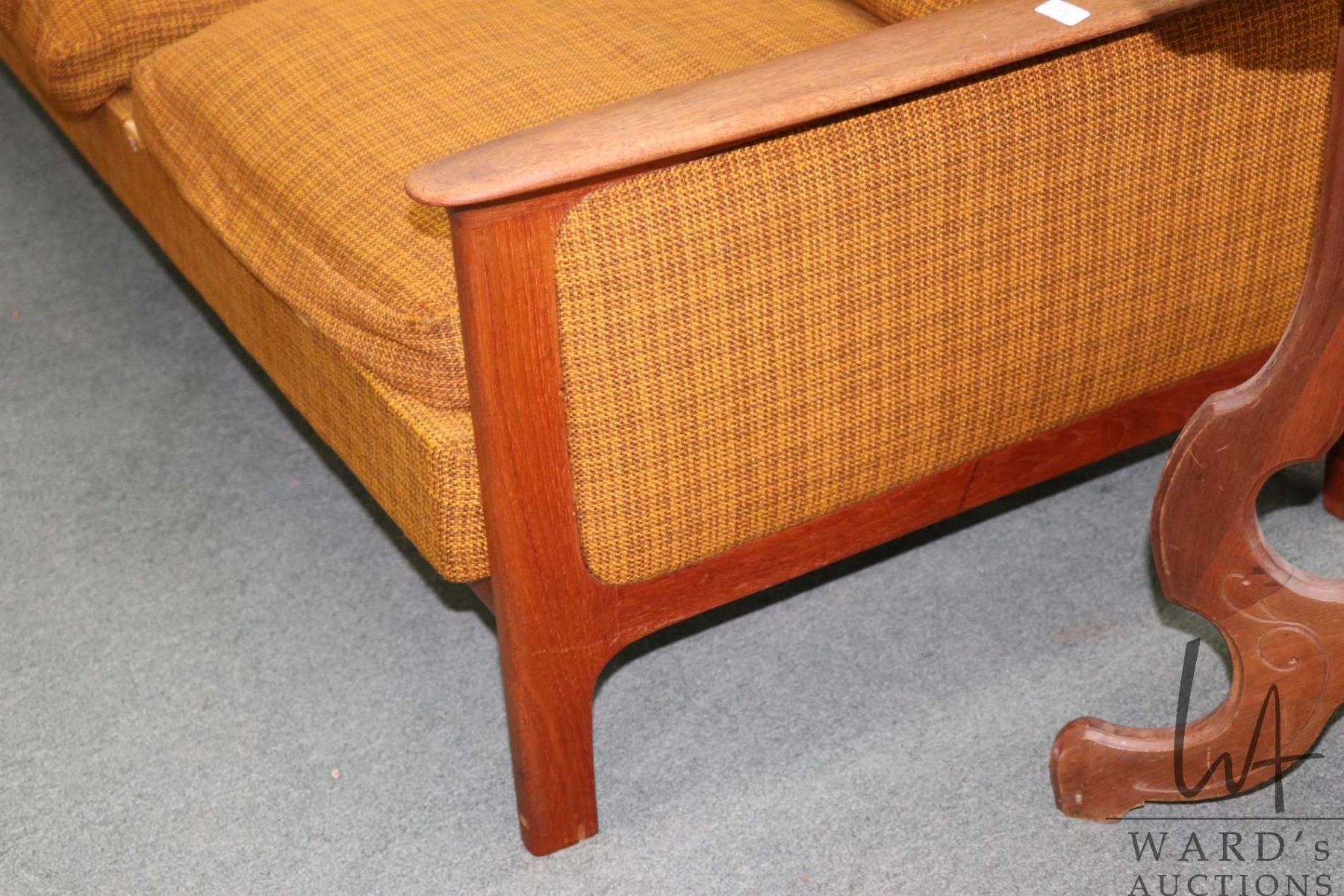 Mid century, teak framed parlour set with full sized sofa and arm chairs