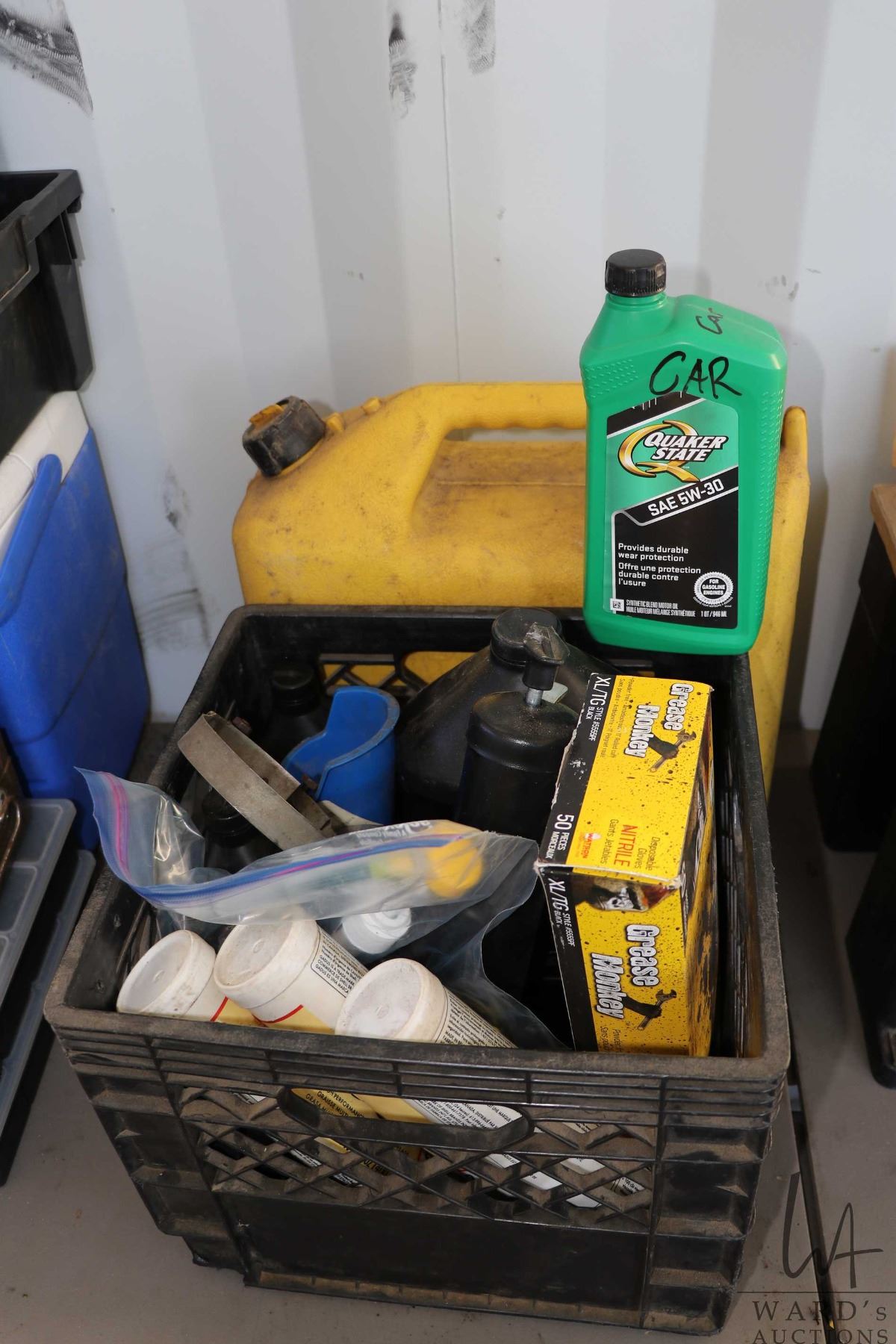 Milk crate and contents including grease and oils, diesel jerry can, mostly opened with some content