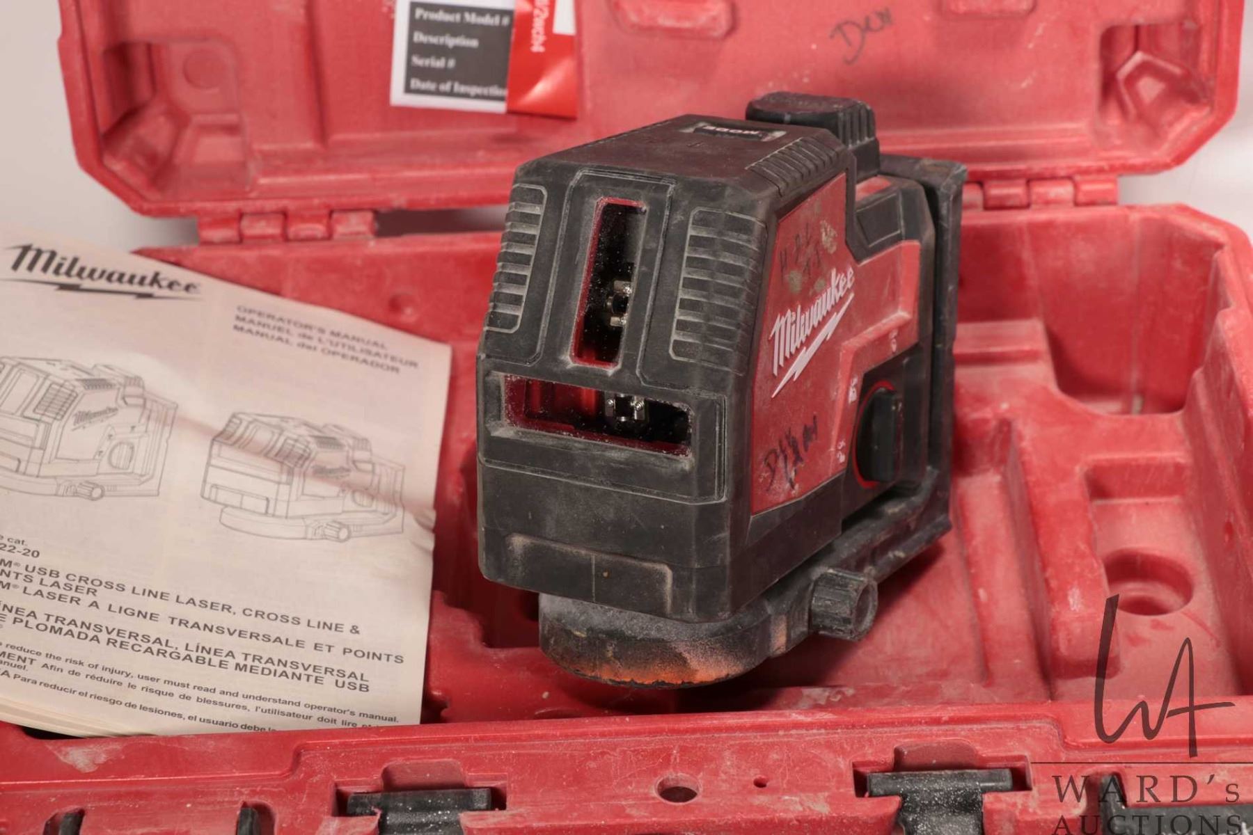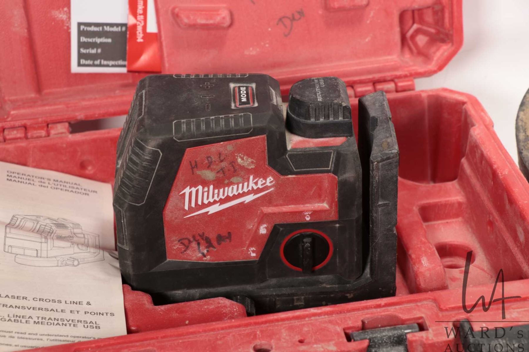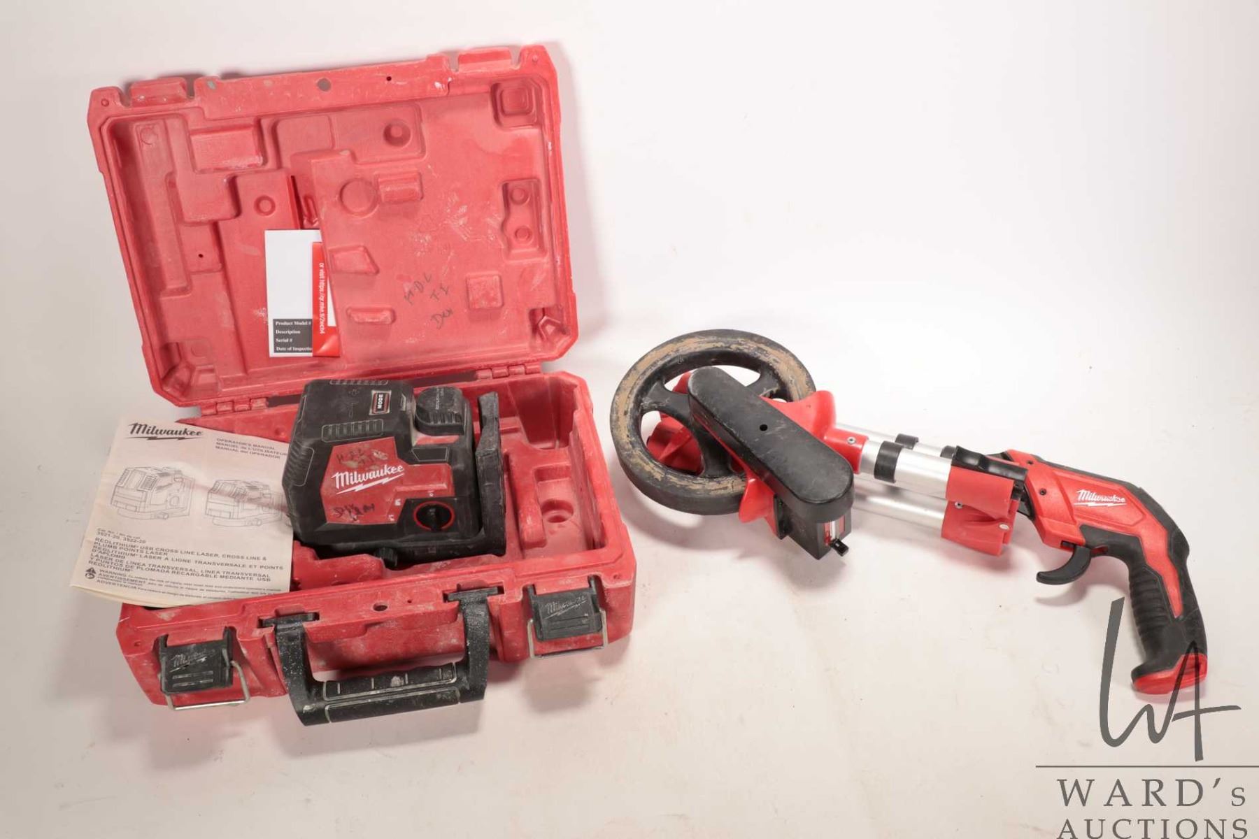 Milwaukee Redlithium USB Cross Line Laser and Cross Line & Plum Points laser plus two adjustable measuring poles and a Milwaukee distance counter