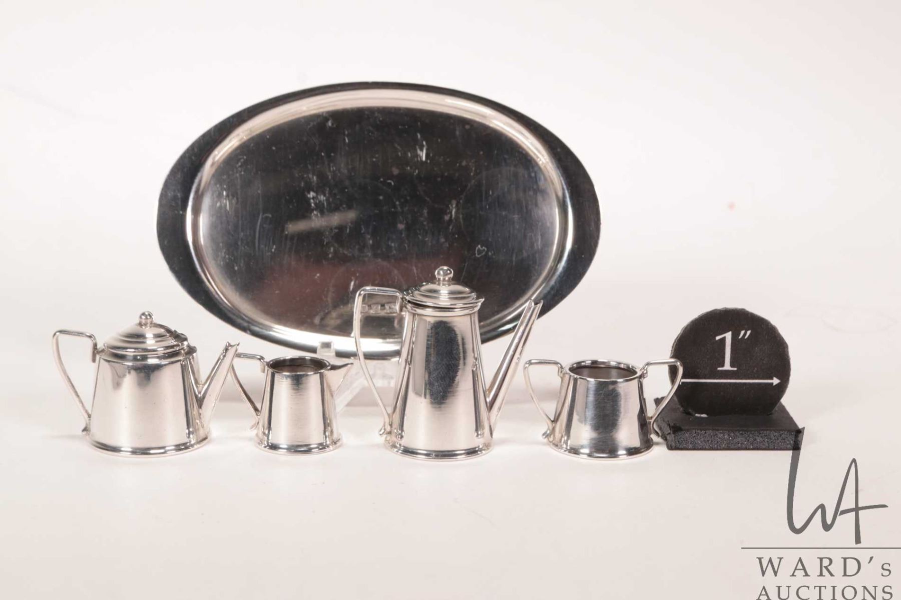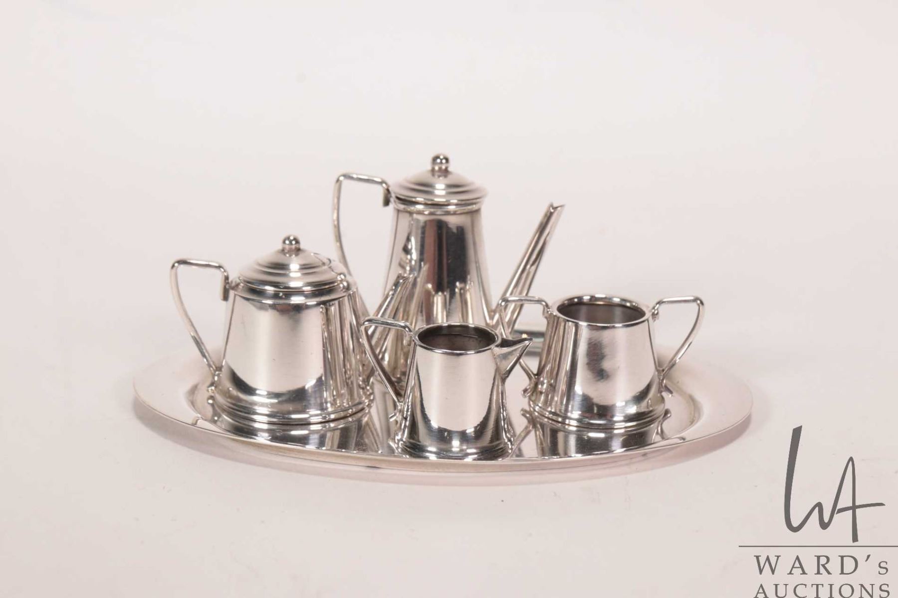 Miniature sterling silver tea set including tea and coffee pot, cream and sugar on 4" oval tray, all