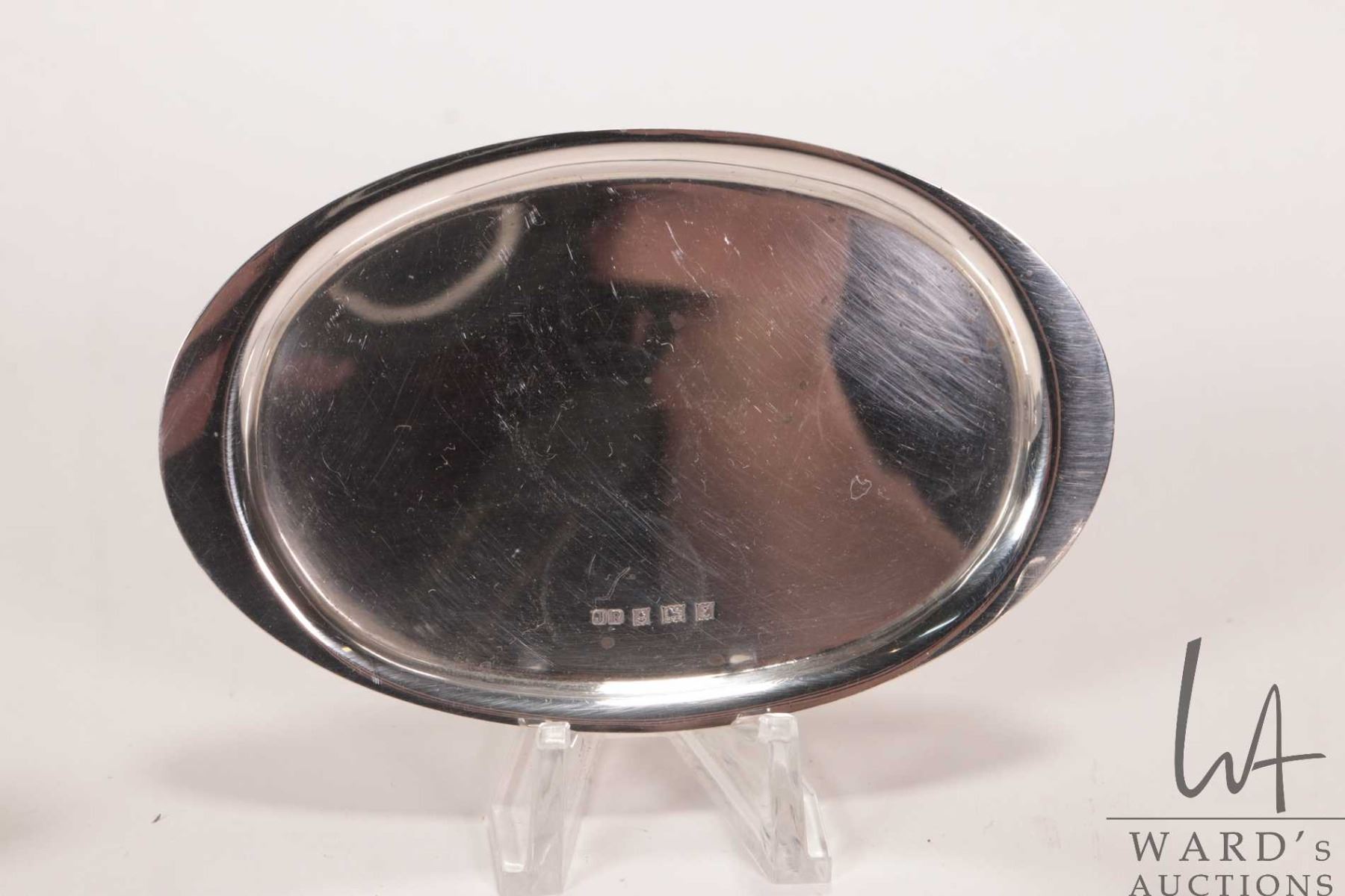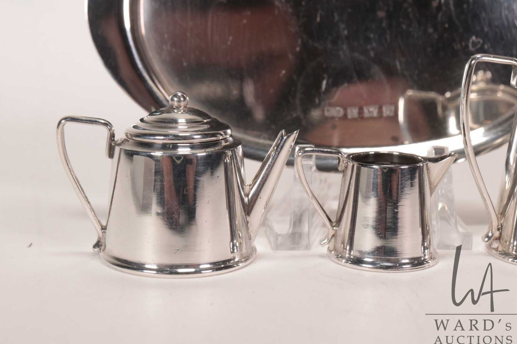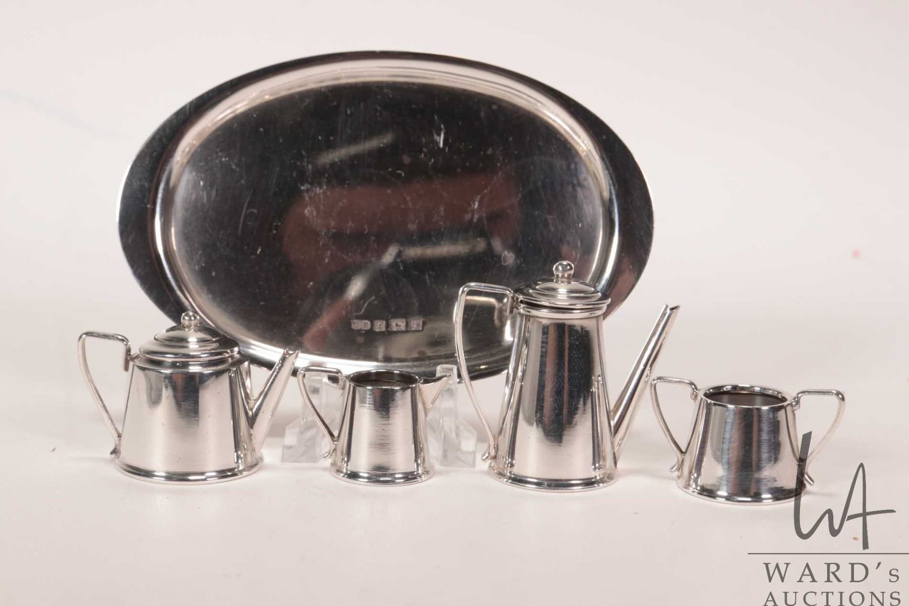 Miniature sterling silver tea set including tea and coffee pot, cream and sugar on 4" oval tray, all with British sterling hallmarks
