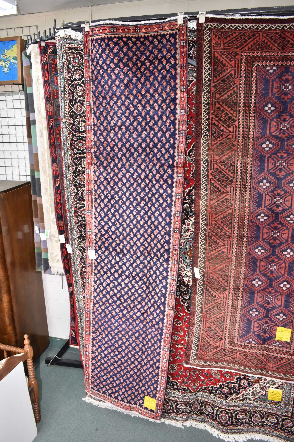 Mir 100% wool carpet runner with overall paisley pattern in shades of blue, cream, red etc. 28" x 112"