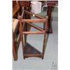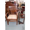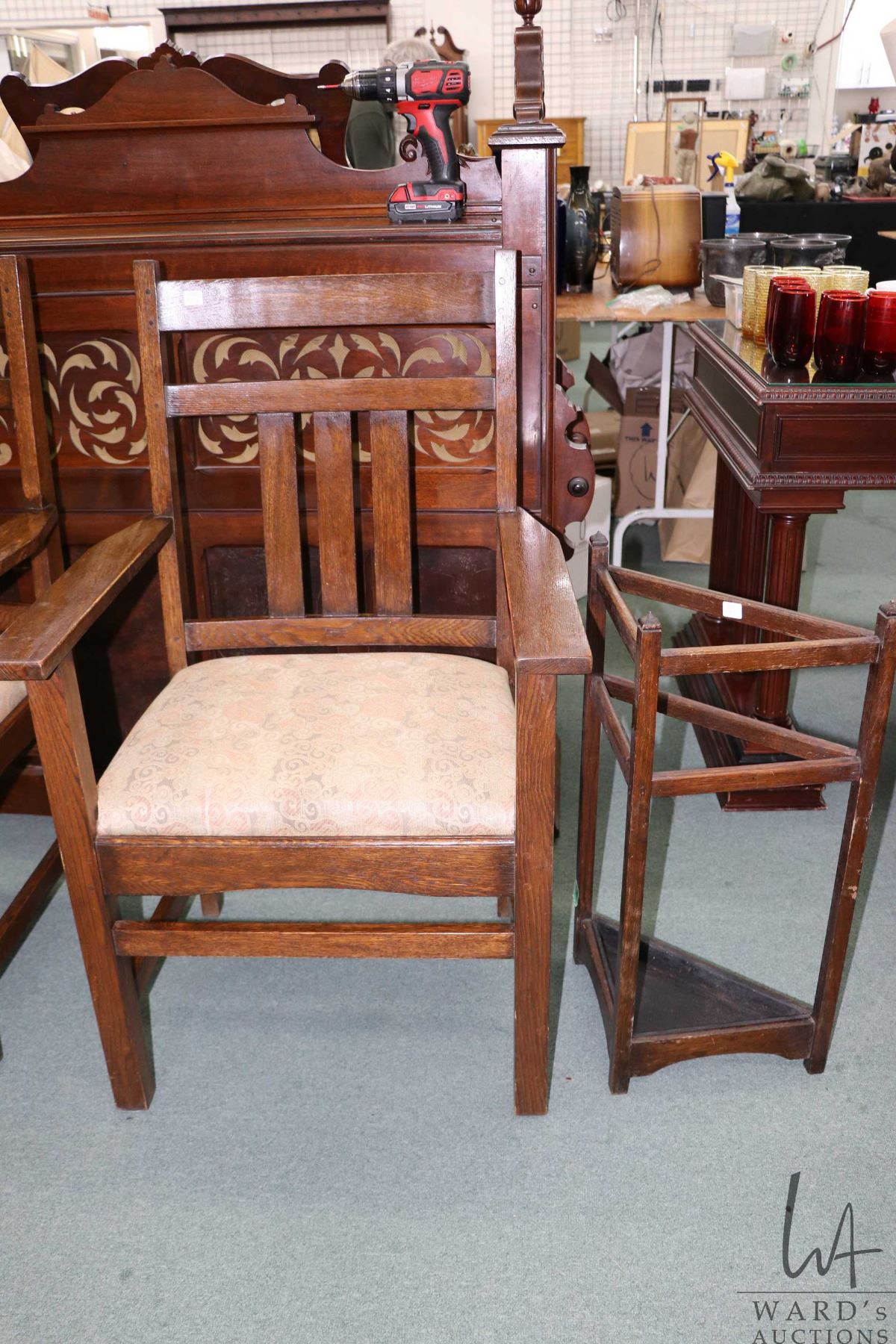 Mission style open arm oak parlour chair and tri-angular stick/ umbrella stand with drip tray