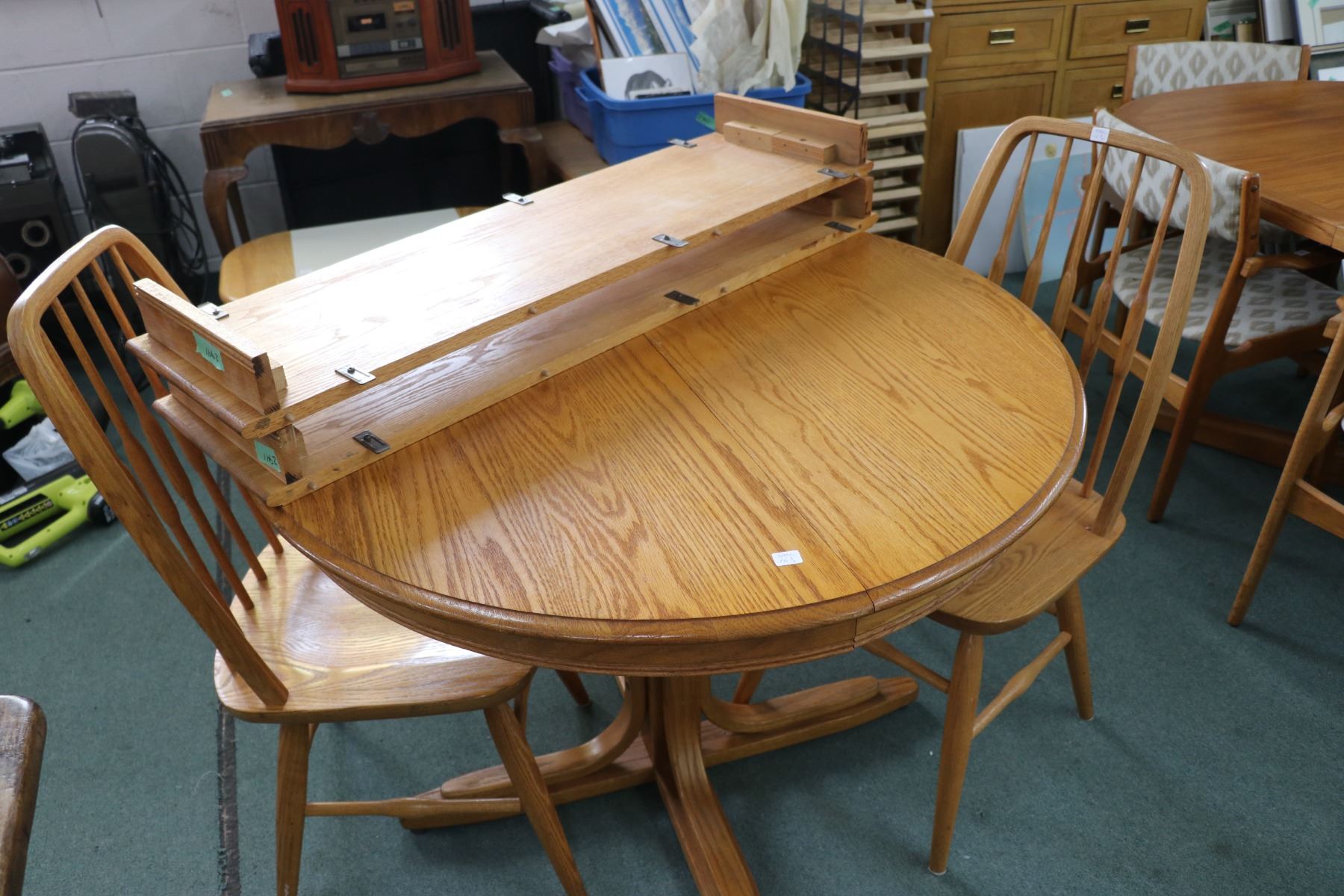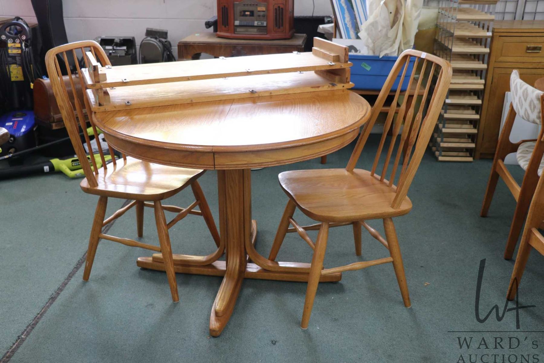 Modern 41" diameter center pedestal dinette table with two 12" insert leaves plus two spindle back chairs
