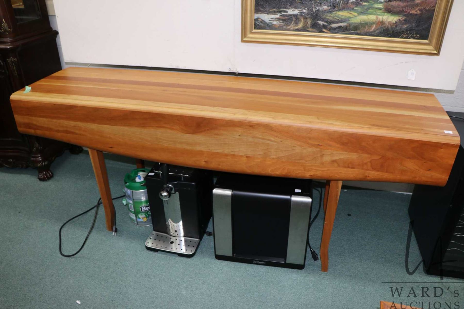 Modern, Matthew Hilton designed, cherry drop leaf table, 74 1/2" X 19" plus two 9 1/2" leaves