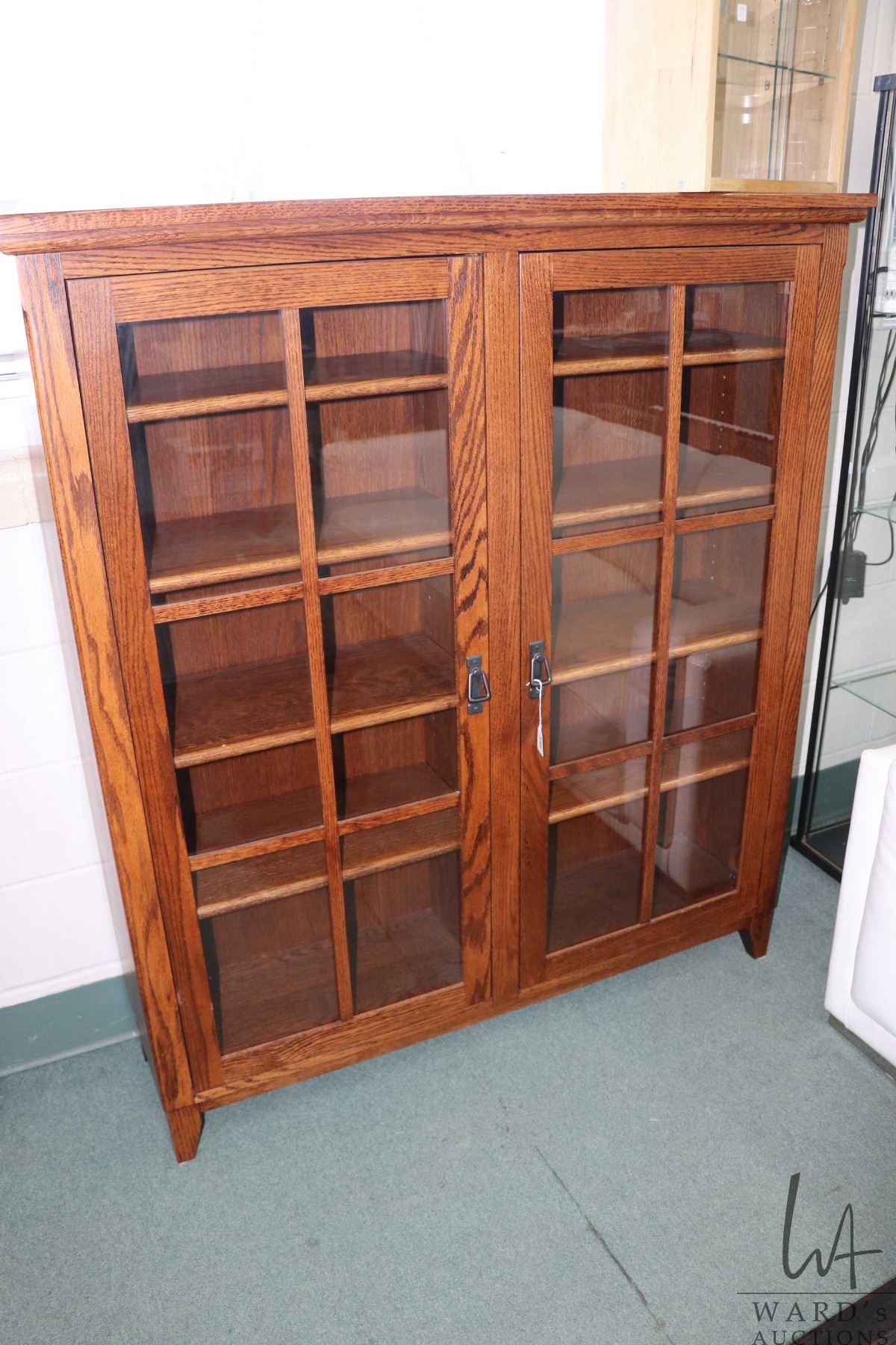 Modern Mission style oak two door bookcase/ display cabinet, 57" H X 50" W X 13" D