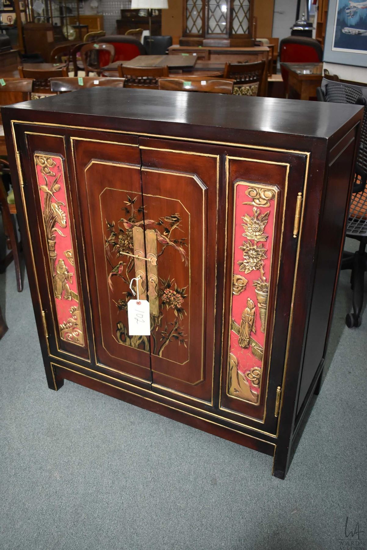 Modern Oriental style two door cabinet with carved and painted panels, 39" in height and 35" wide