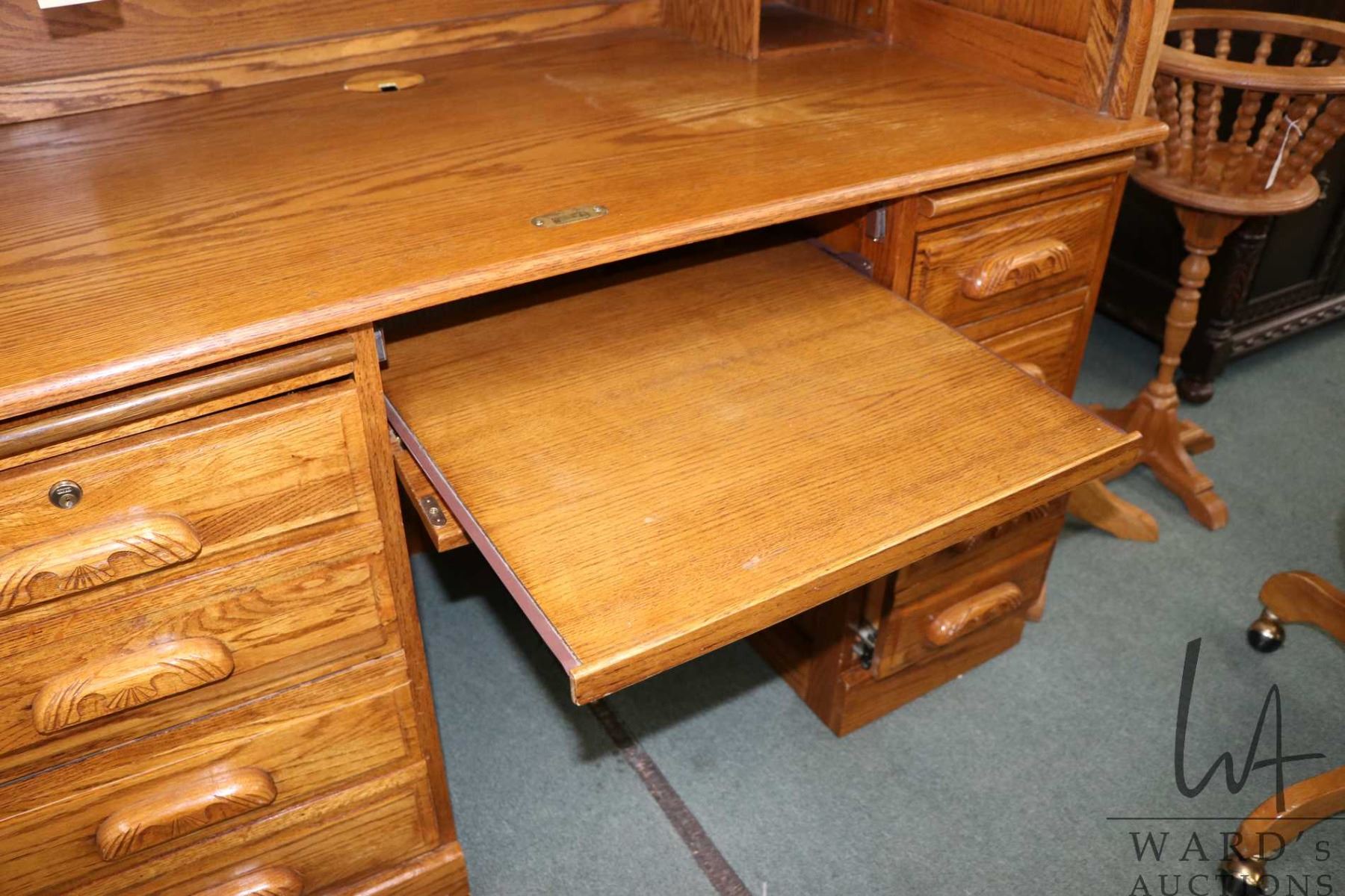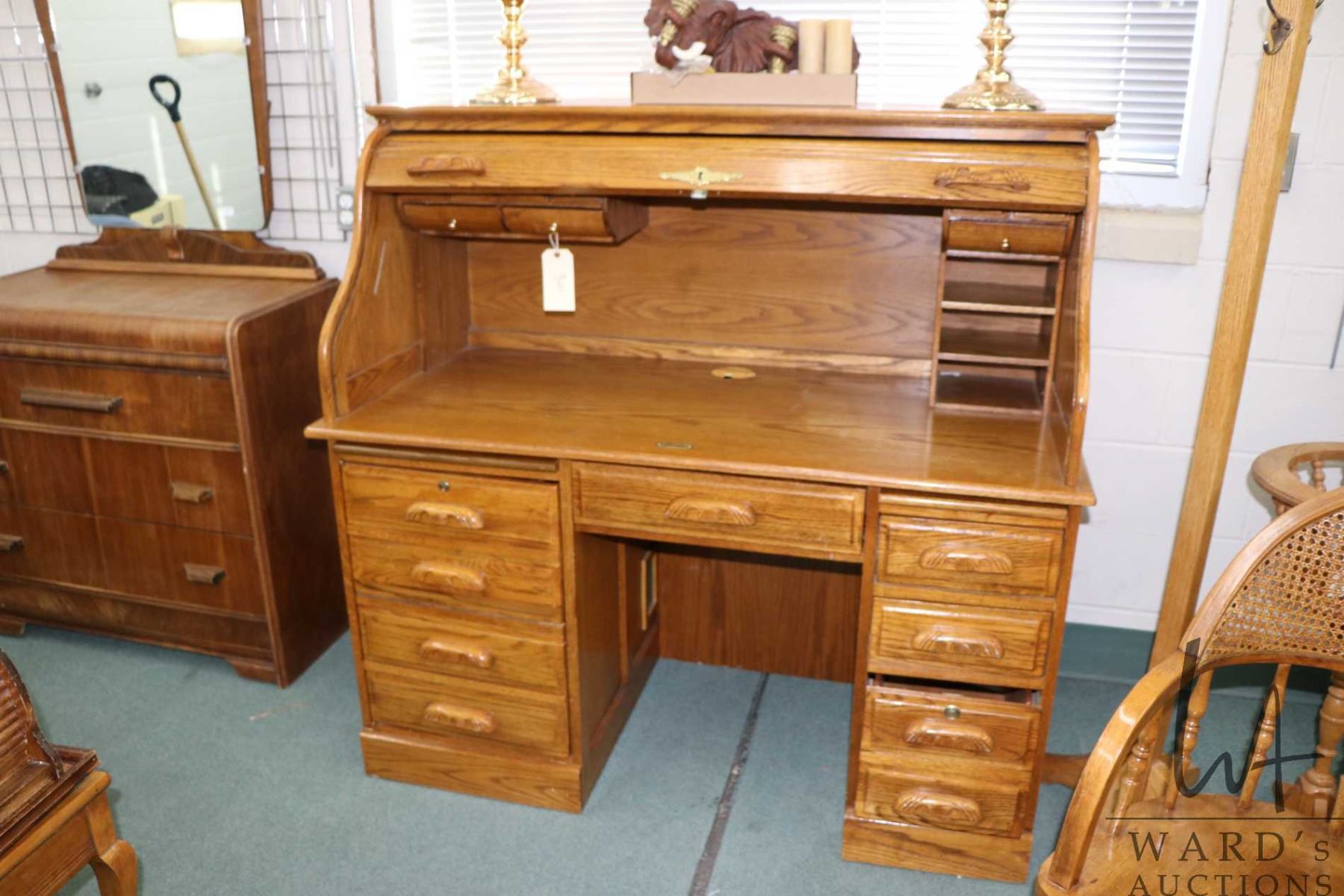 Modern S curve roll top desk designed for use with a computer including computer storage, keyboard shelf etc. 54" X 29" X 52" high
