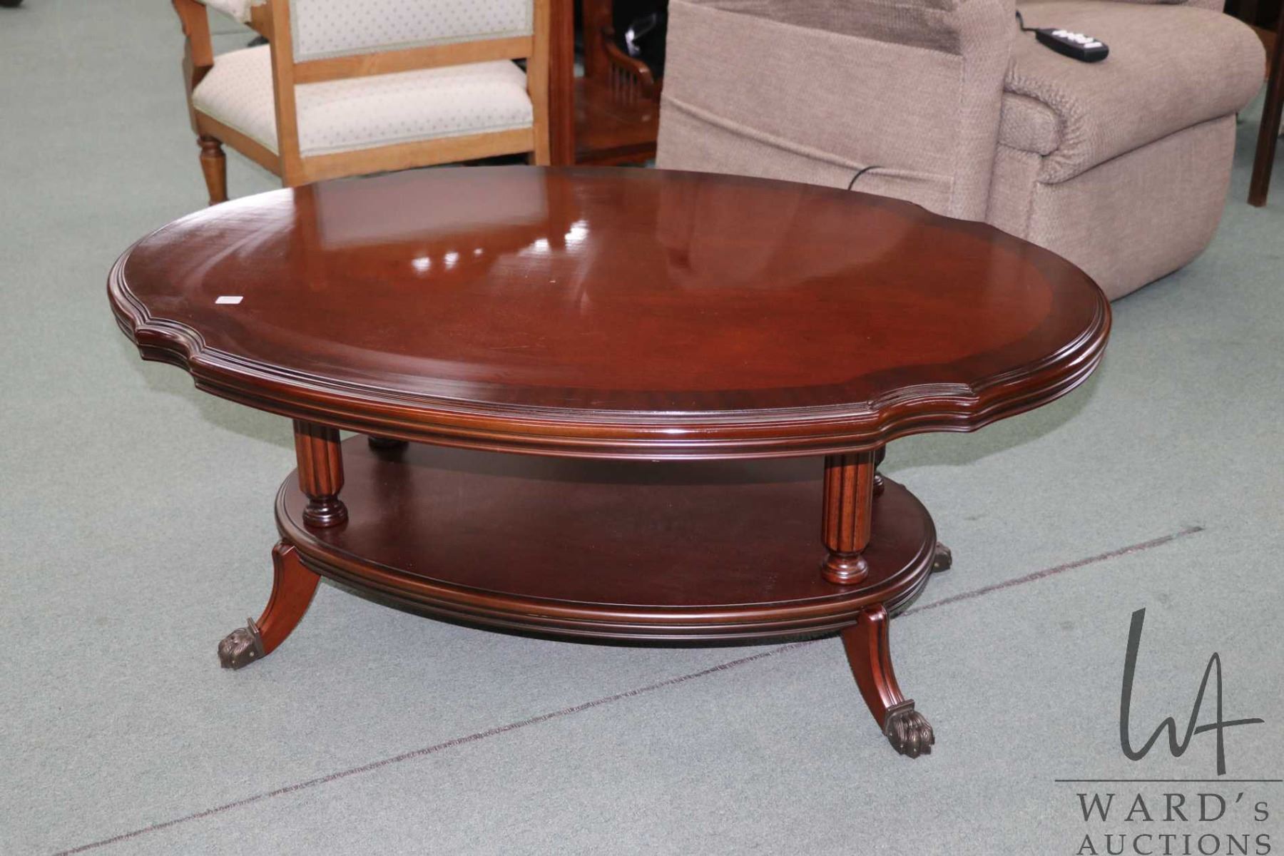 Modern antique style coffee table with metal capped, claw feet, 18" H X 44" X 30"