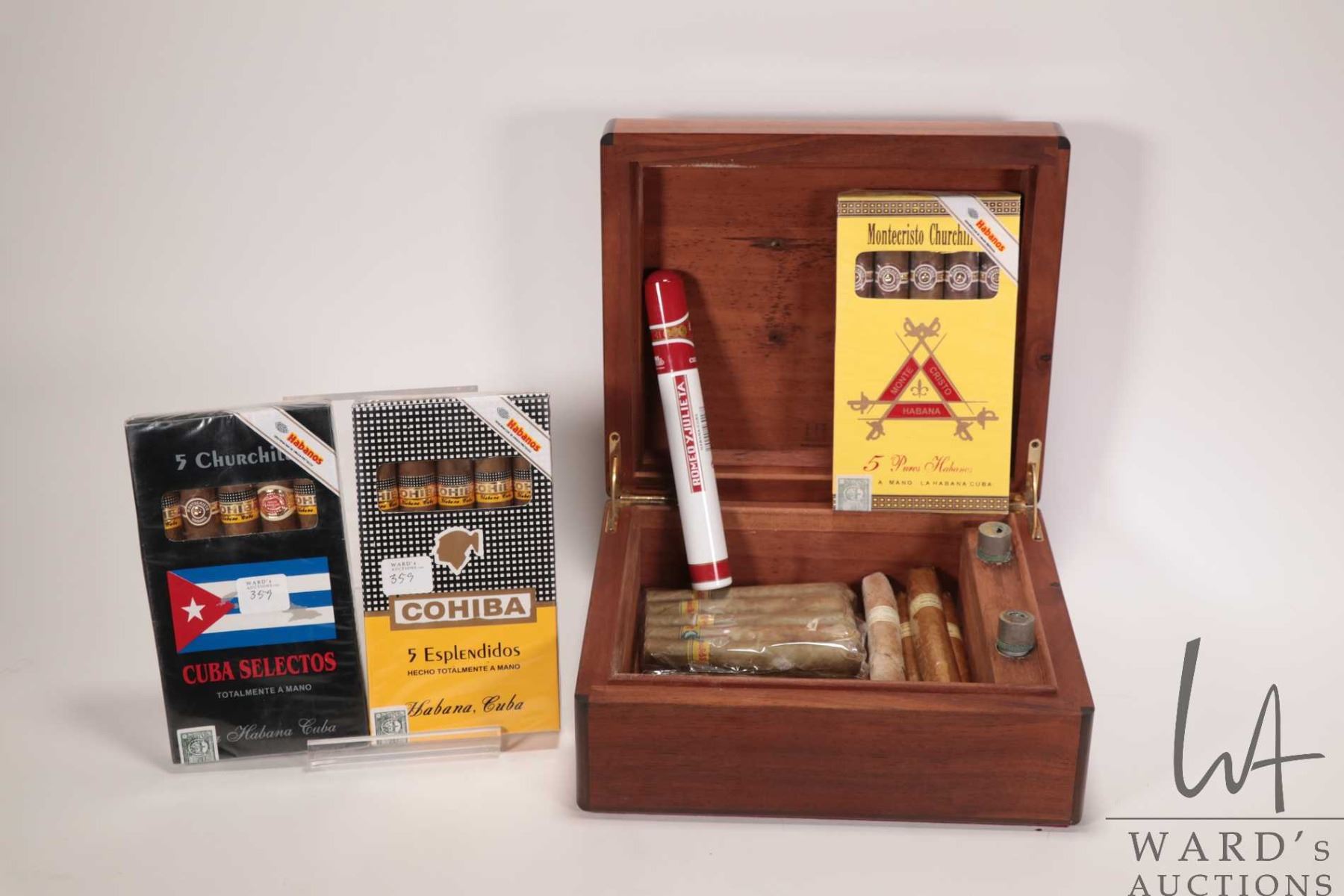 Modern cigar humidor and selection of cigars including Cohiba, Monte Cristo, etc