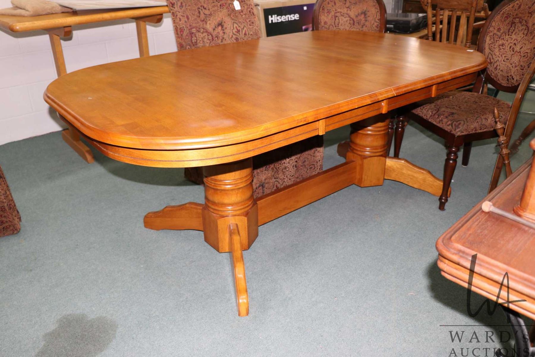 Modern double pedestal dining table 29" H X 42" W X 72" L plus two 12" jack knife leaves