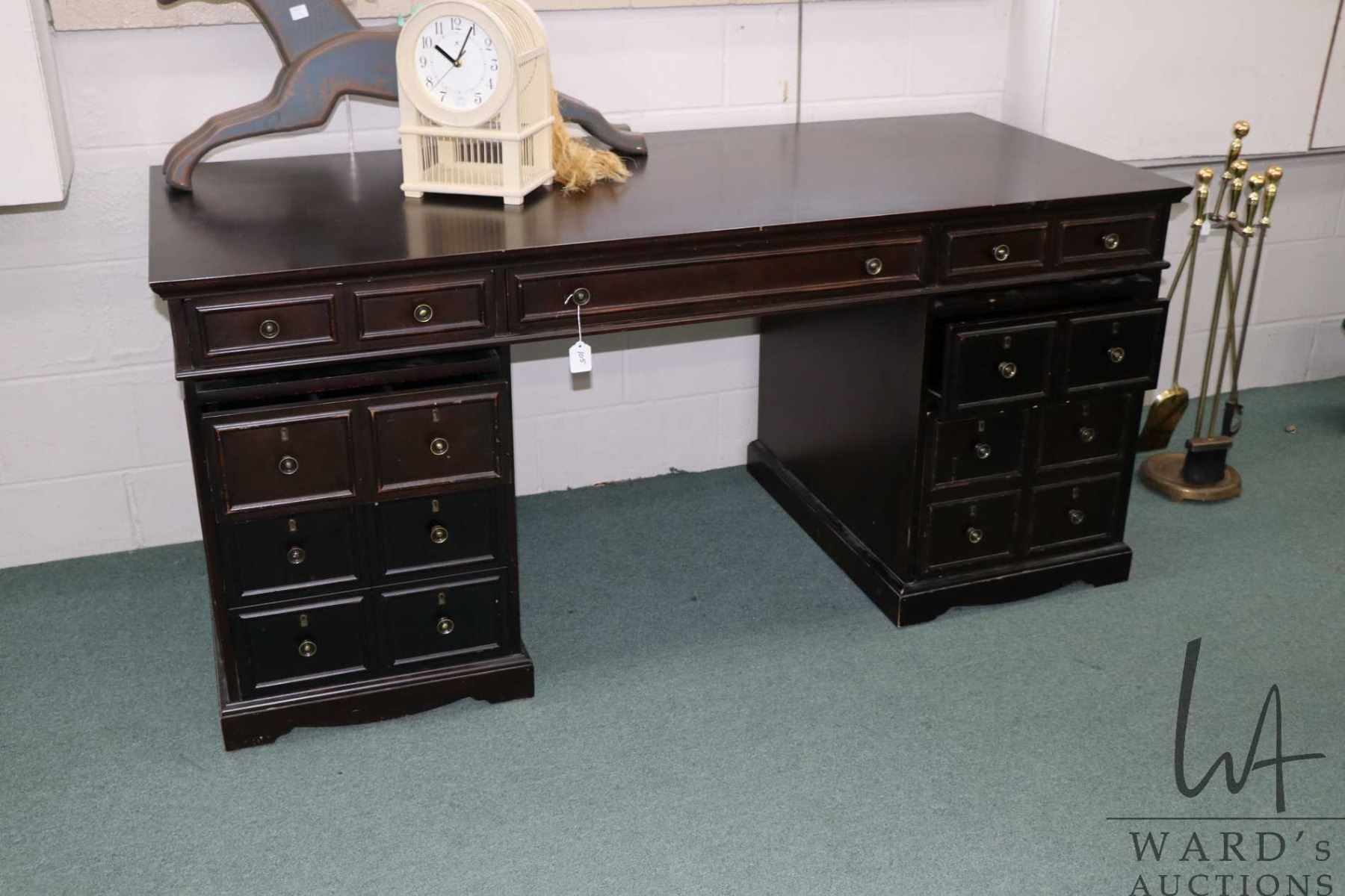 Modern double pedestal office desk with file drawers on each side, note: top and pedestal separate f