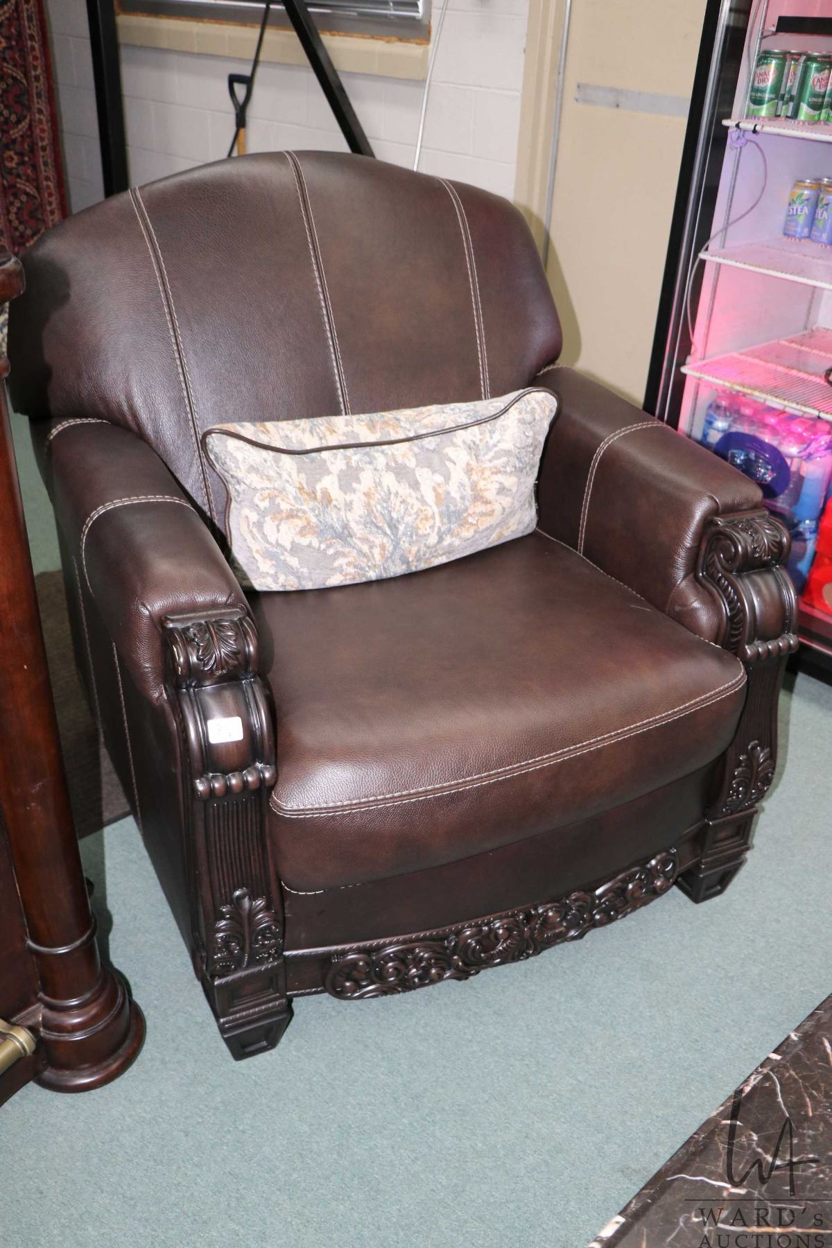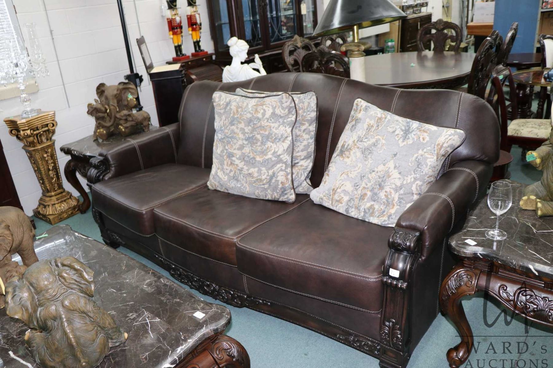 Modern full sized sofa and parlour chair with carved show wood and throw pillows