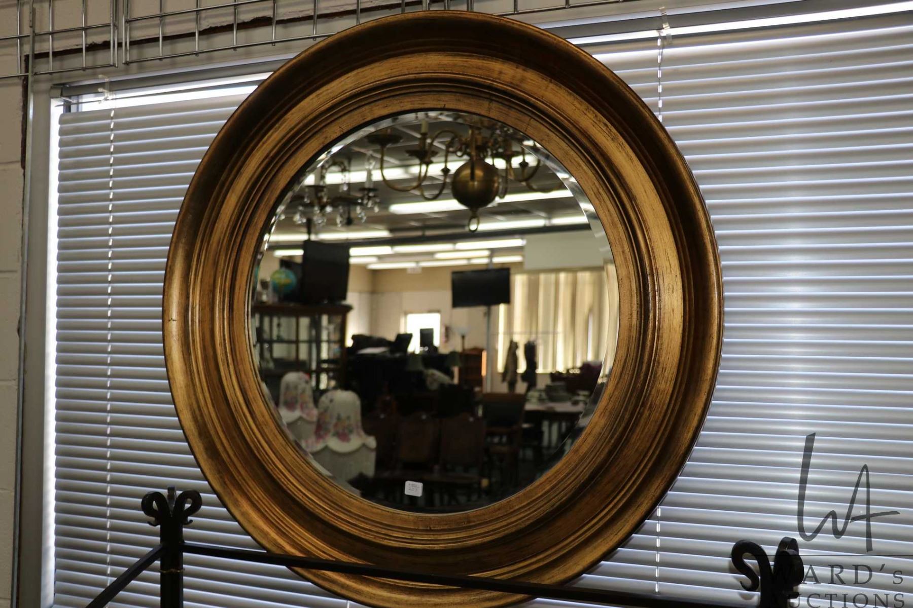 Modern gilt framed beveled wall mirror 34" outside diameter