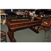 Modern glass top three drawer, library table style desk with keyboard drawer and column style supports, made by Bombay Company, 32" H X 65" W X 29" D