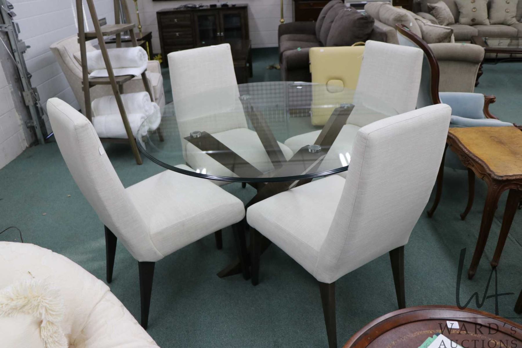 Modern glass topped dining table on bent wood supports 48" round, with four upholstered wood framed dining chairs