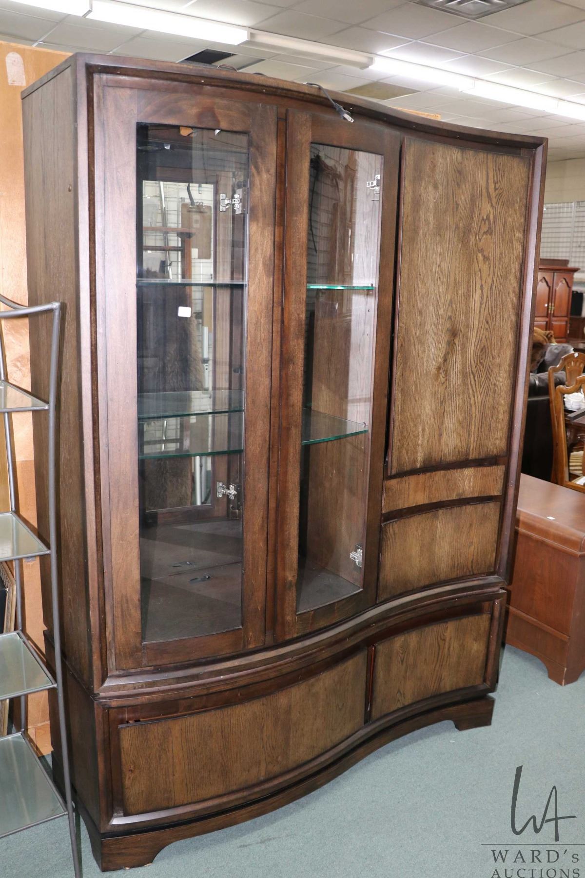 Modern illuminated curved glass display/ storage cabinet, made by Legacy Classic Furniture, 73" H X 53" W X 20" D