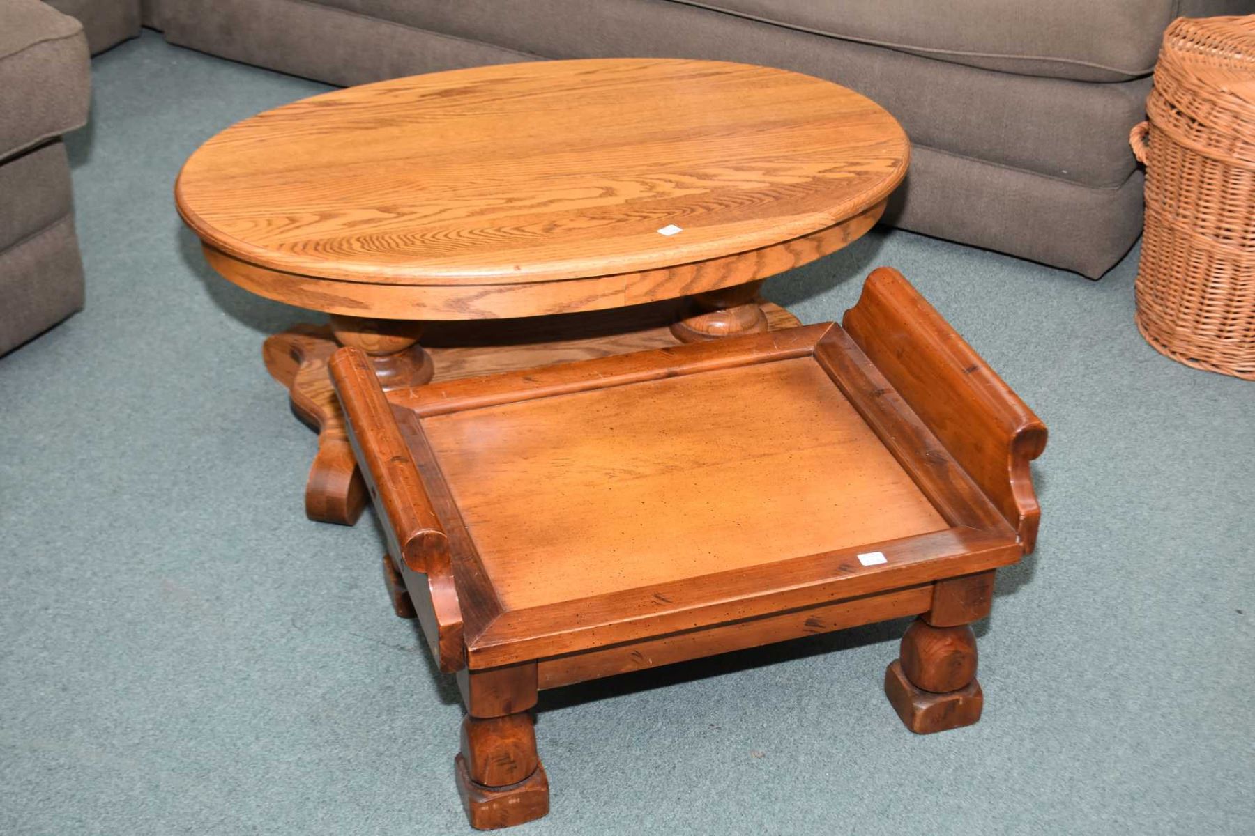 Modern oak double pedestal Empire style coffee table with a semi contemporary ottoman missing upholstered pad