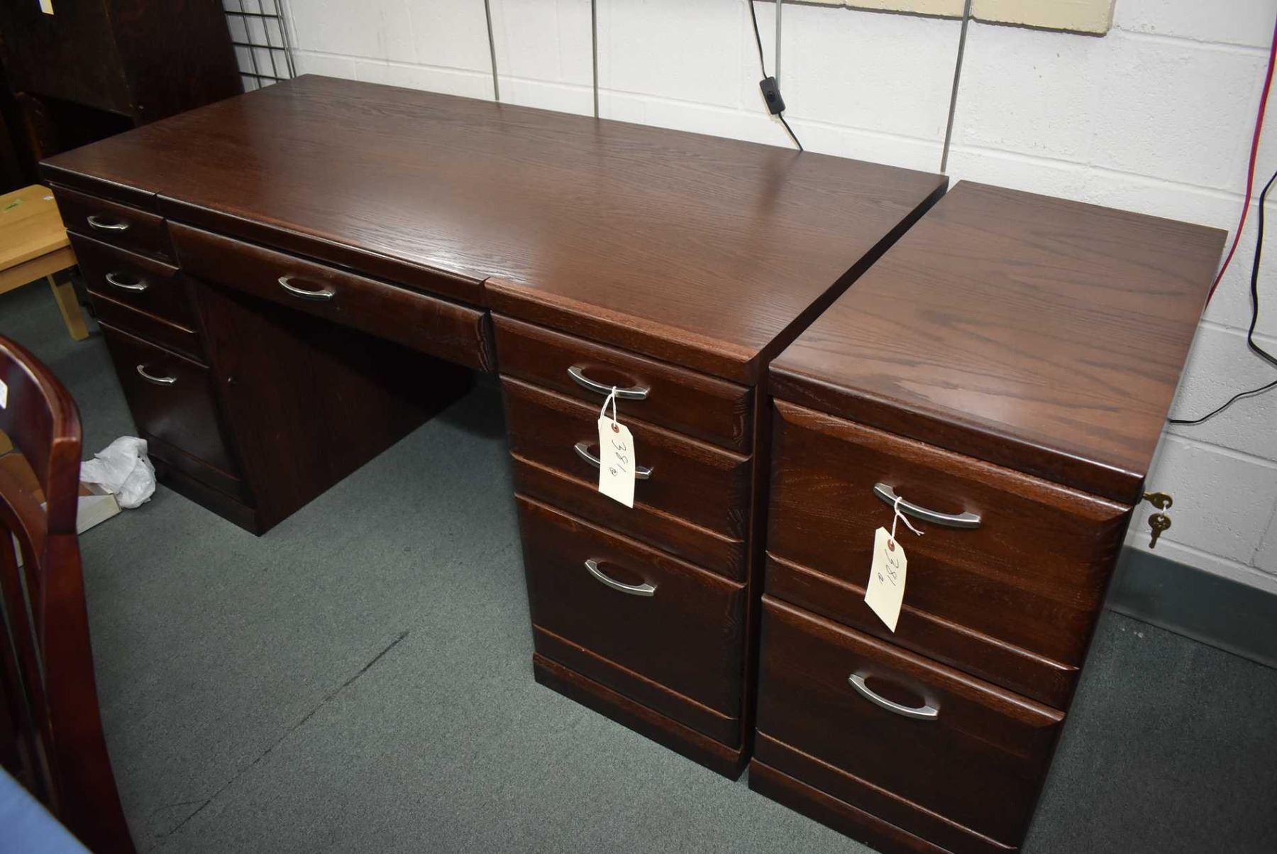 Modern oak double pedestal computer desk plus matching two drawer filing cabinet