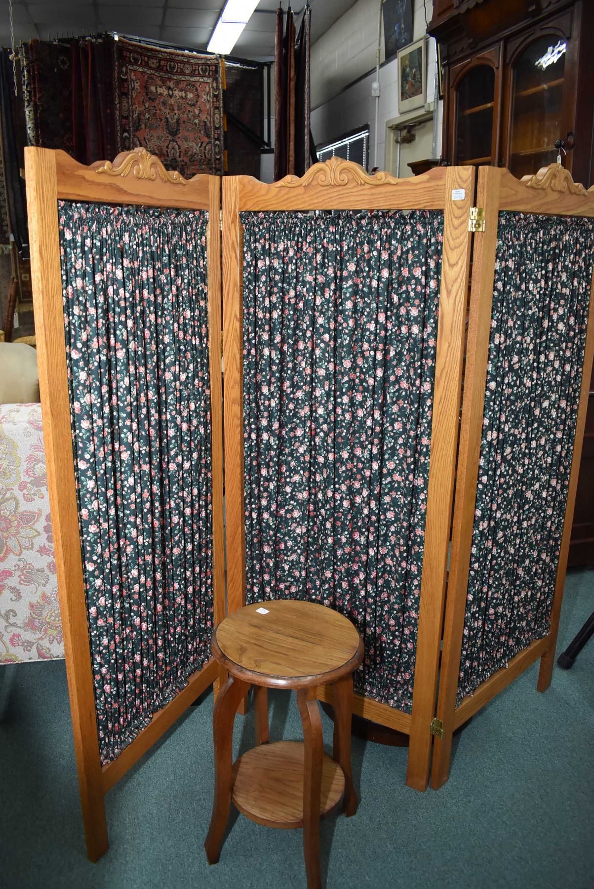 Modern oak framed fabric lined three panel room divider and a small oak plant stand