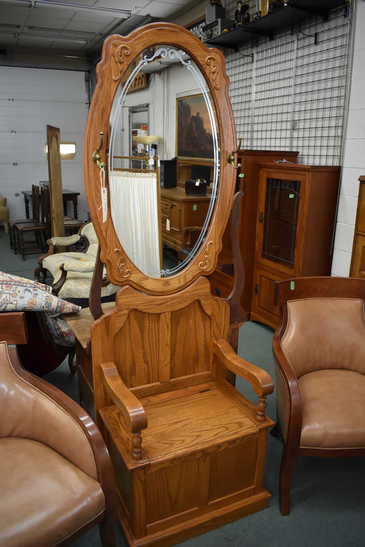 Modern oak hall seat with mirrored back and coat hooks complete with flip seat storage area