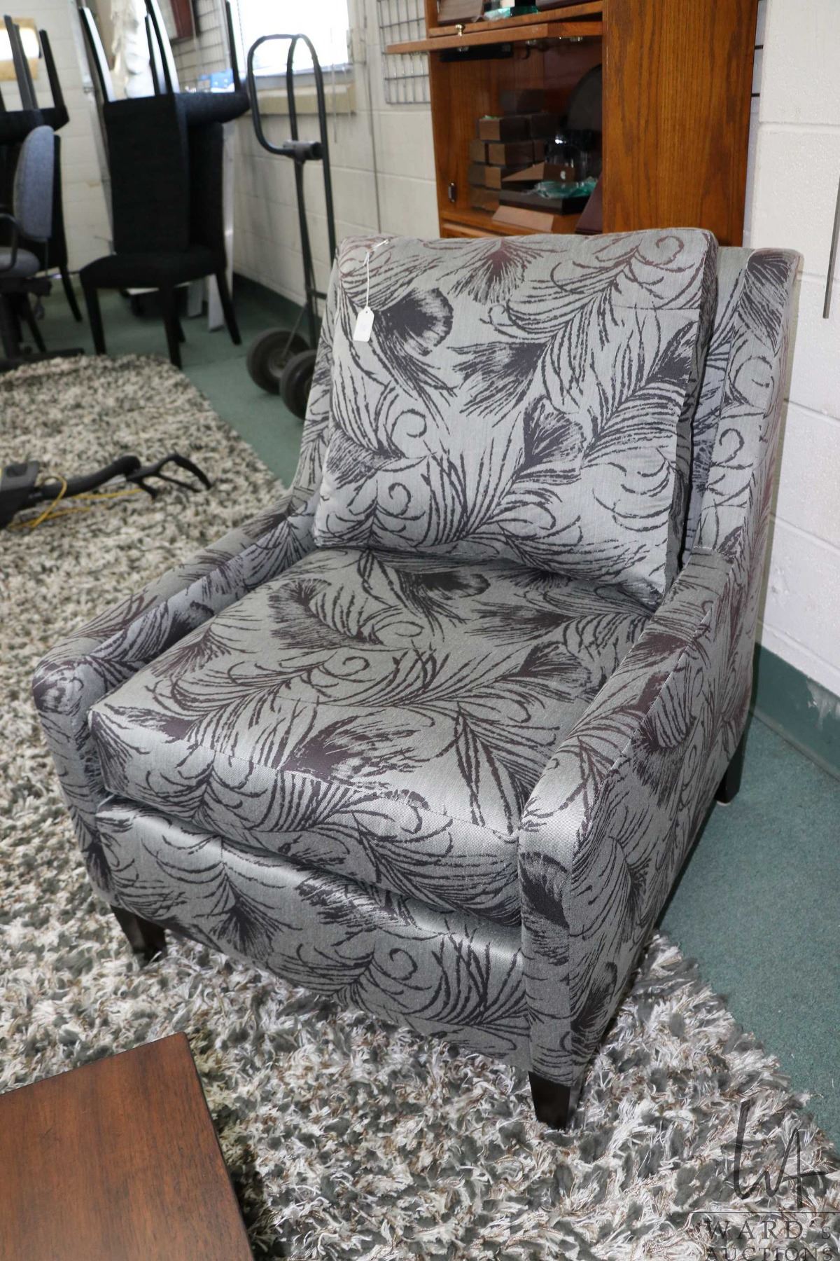 Modern parlour chair with feather patterned upholstery, purchased at Cottswood