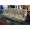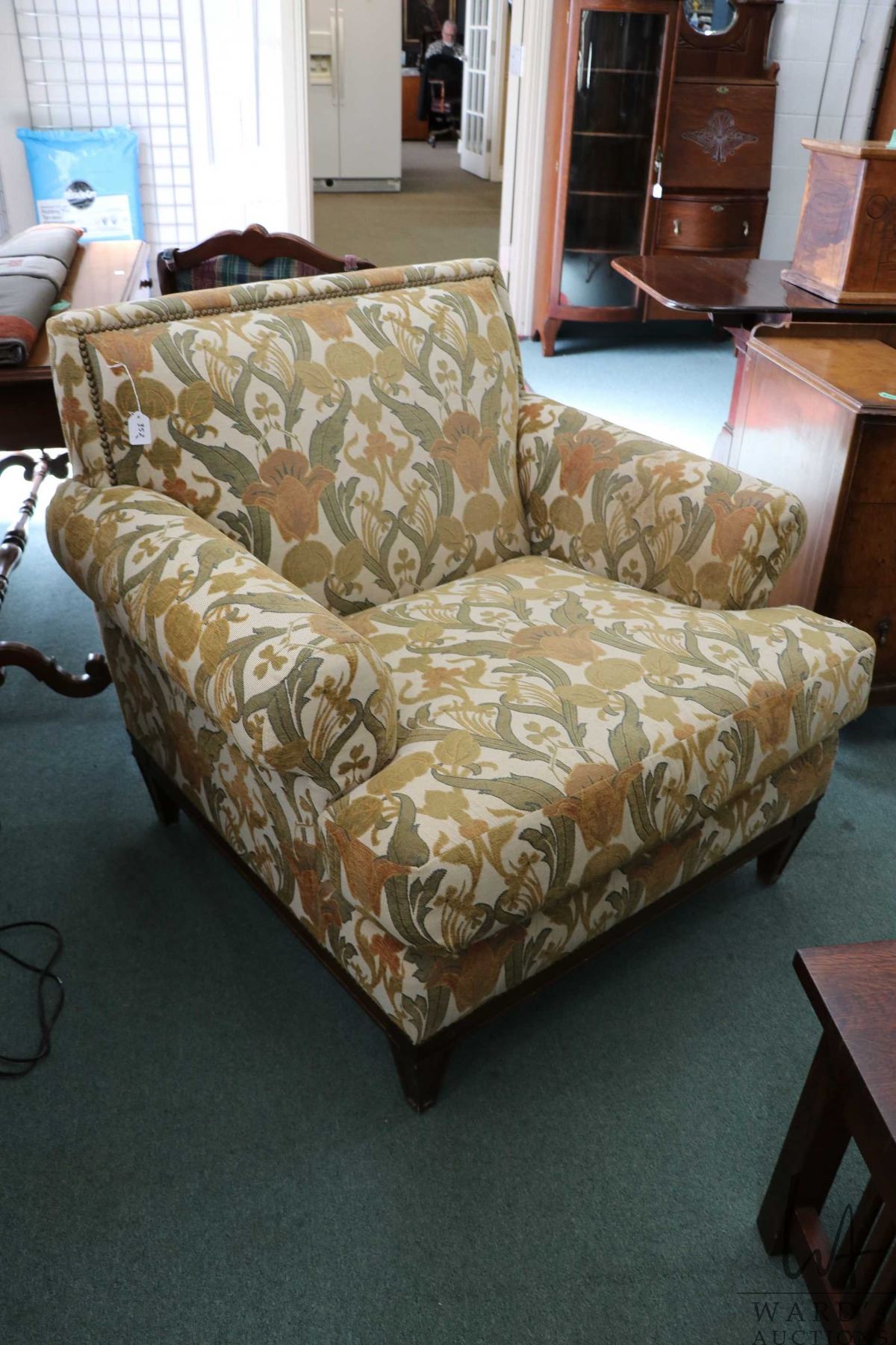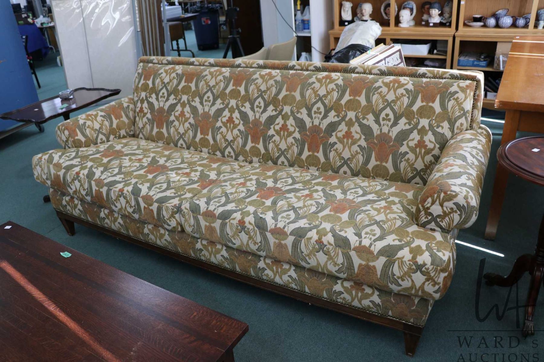 Modern retro style full sized sofa and arm chair, made in the USA by Flair Berhardt Division, with William Morris style cloth upholstery and nail head decoration