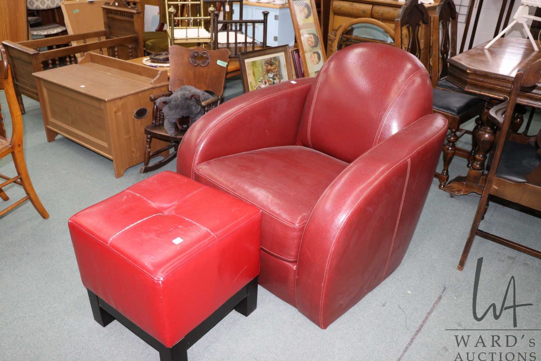 Modern upholstered, retro style parlour chair with non-matching upholstered ottoman