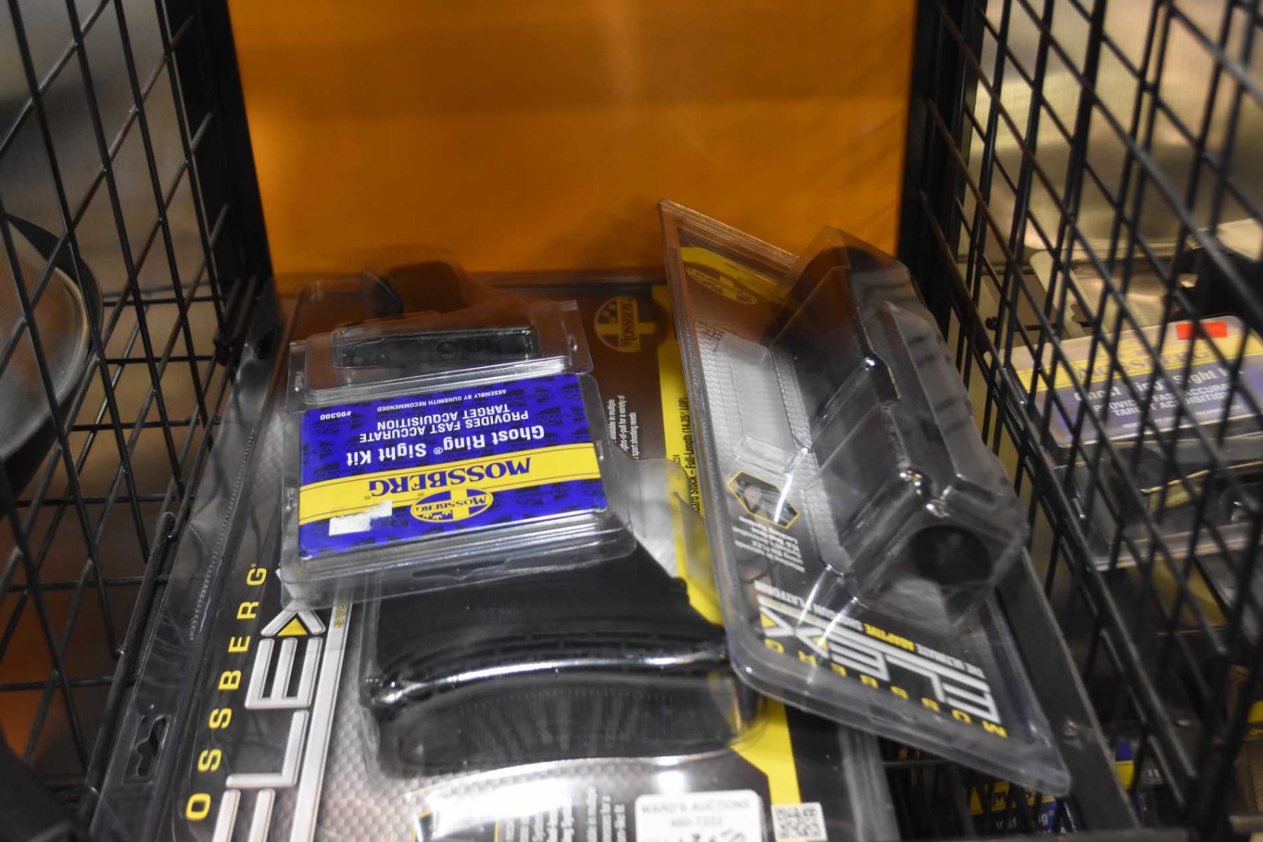 Mossberg ghost ring sight kit no. 95300, Mossberg standard forend no. 100748 and a Mossberg flex stock for a 500/590, part # 95224, all new in package