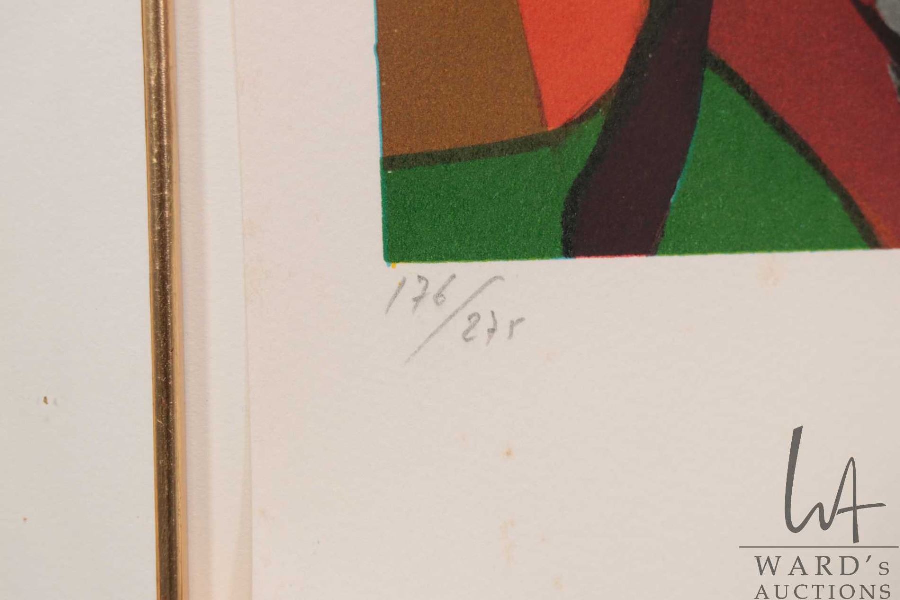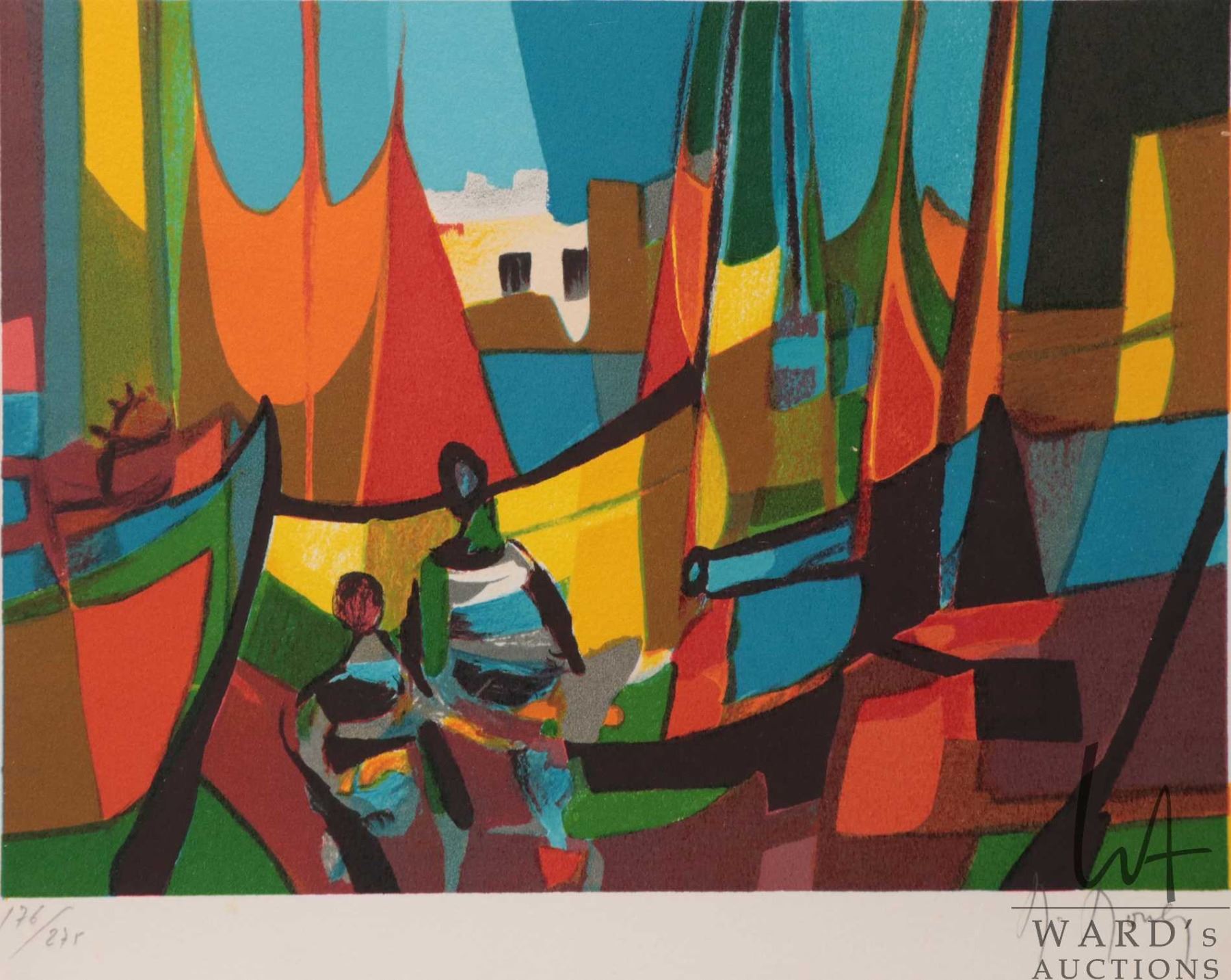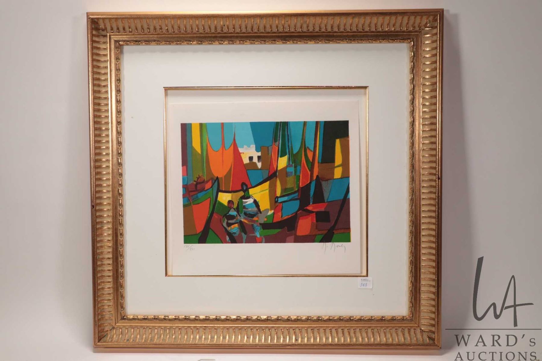 Mouly, Marcel, gilt framed lithograph print " Les Marins Grec, 1994" pencil signed by 176 /275, overall dimensions including frame 23" X 24"/ Note: print is loose in frame