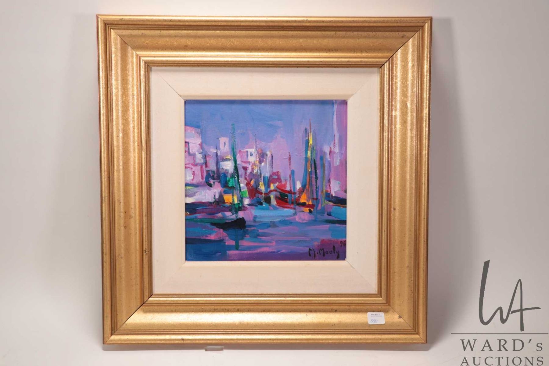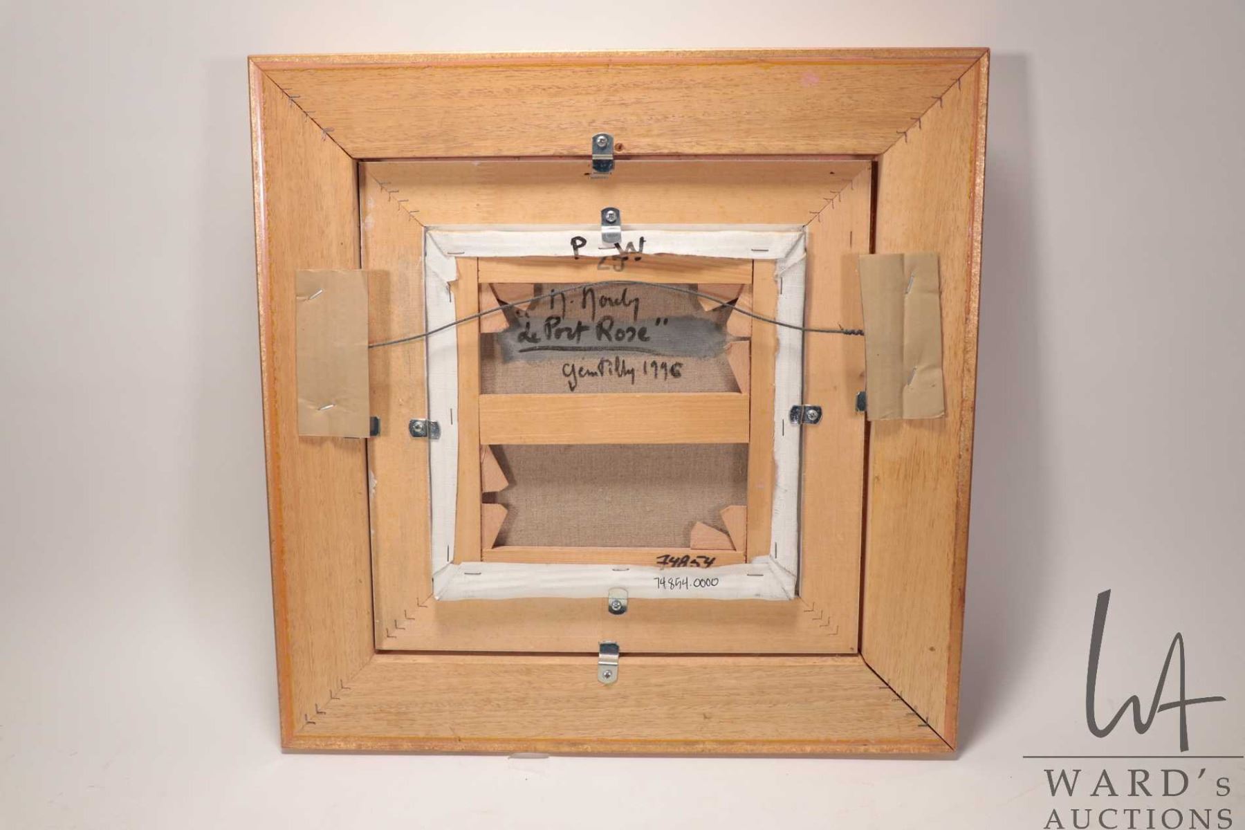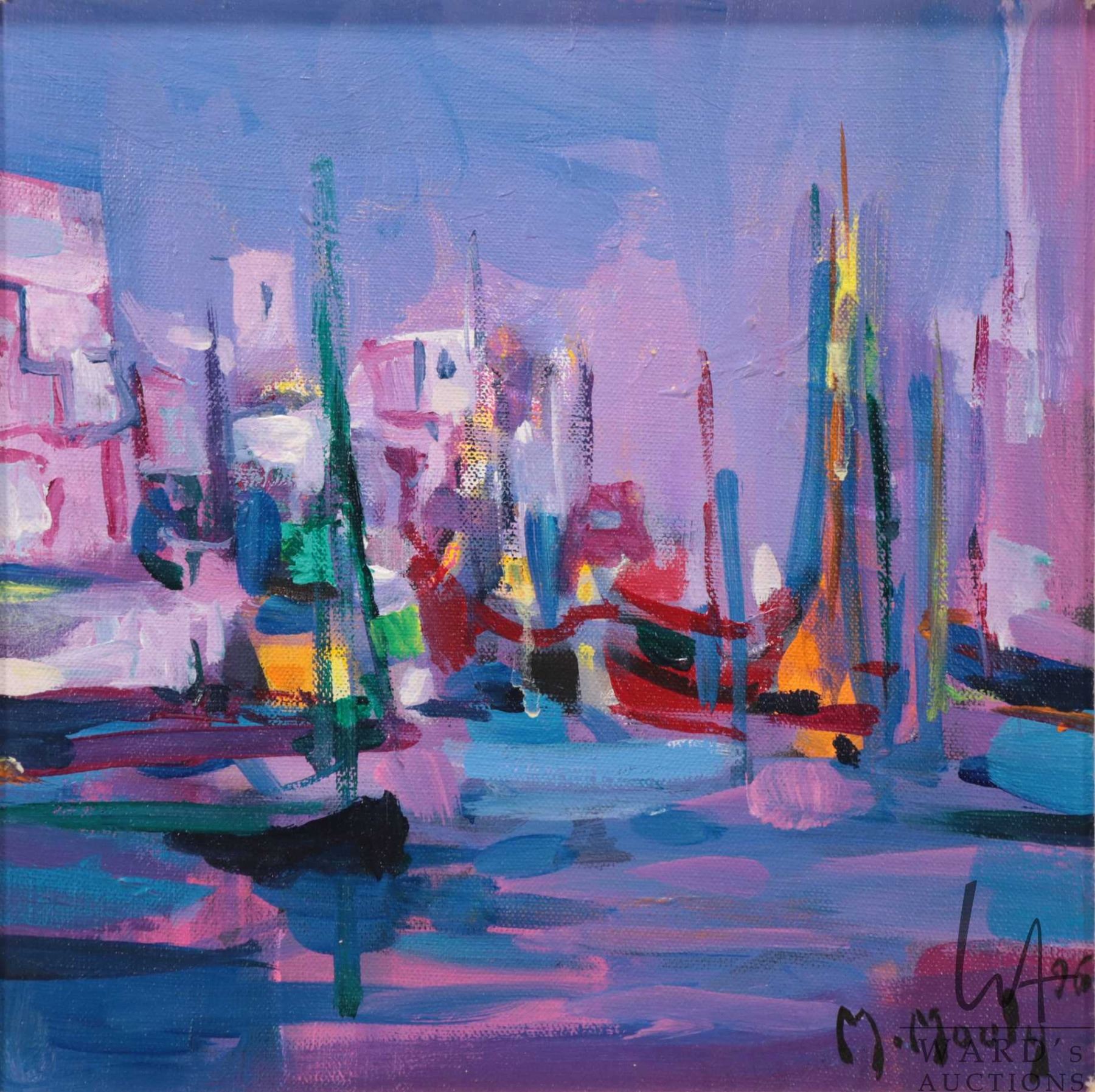 Mouly, Marcel, gilt framed original acrylic on canvas painting, titled on verso "Le Port Rose" signed and dated "Gentilly 1996", 10" X 10"