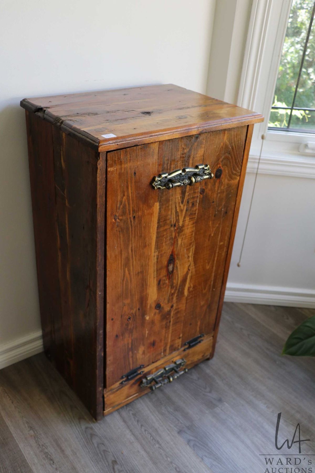 NAMAO LOCATION Country kitchen style garbage can receptacle 33" X 19" X 15" -Note: this is a moving auction from a clean home - Note: No live preview, These items are located in Namao and location and contact information will be given to winning bidders only. Pick up times are July 21st through July 26st by appointment with homeowner. Anything left after 4pm on July 26 will be deemed abandoned