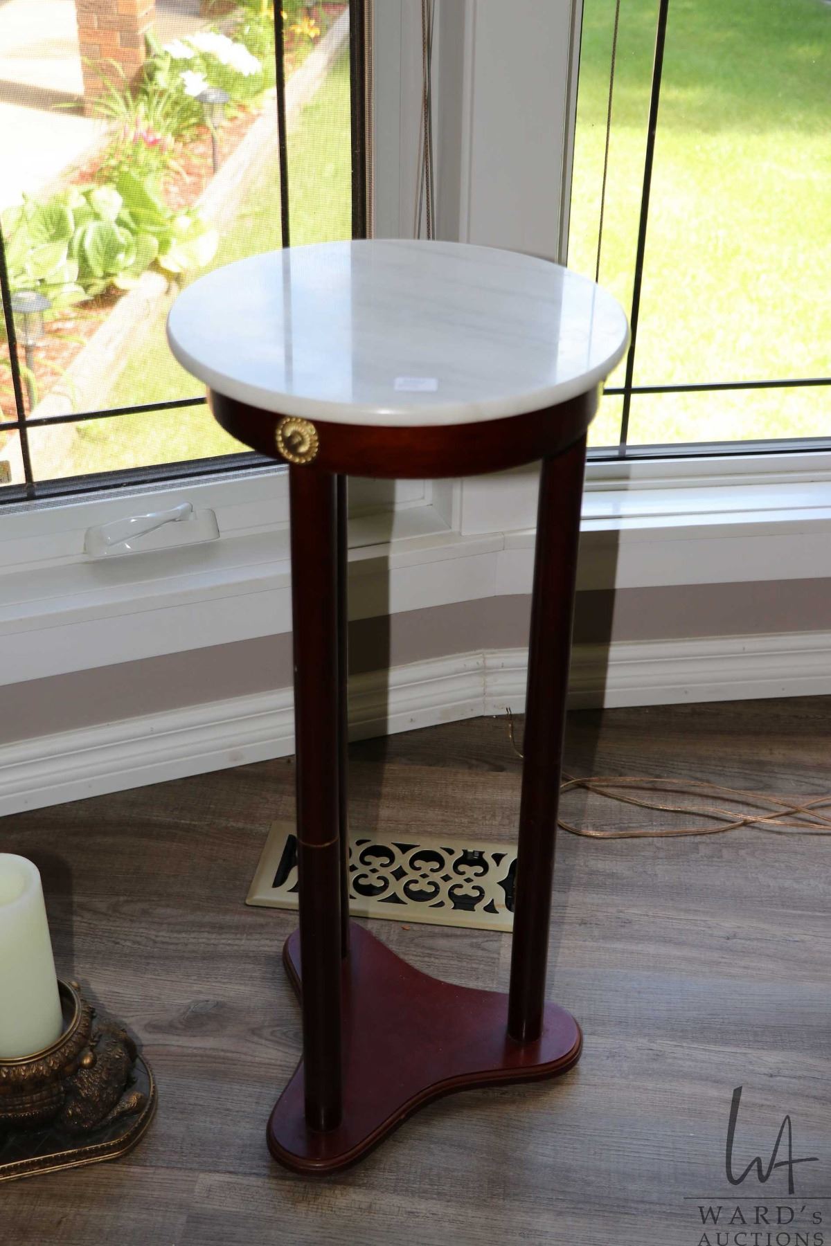 NAMAO LOCATION Fern/ statuary stand with marble top, 27" H X 12" D -Note: this is a moving auction from a clean home - Note: No live preview, These items are located in Namao and location and contact information will be given to winning bidders only. Pick up times are July 21st through July 26st by appointment with homeowner. Anything left after 4pm on July 26 will be deemed abandoned
