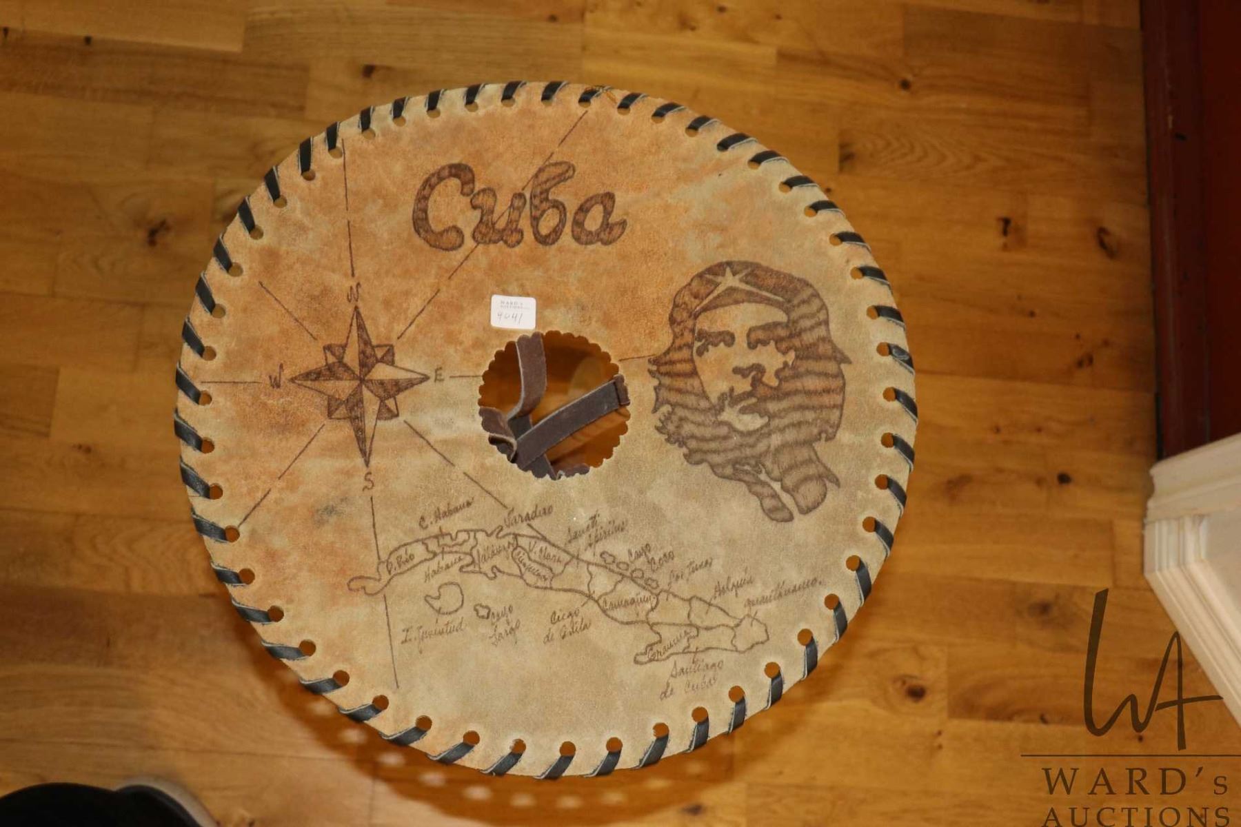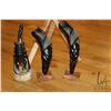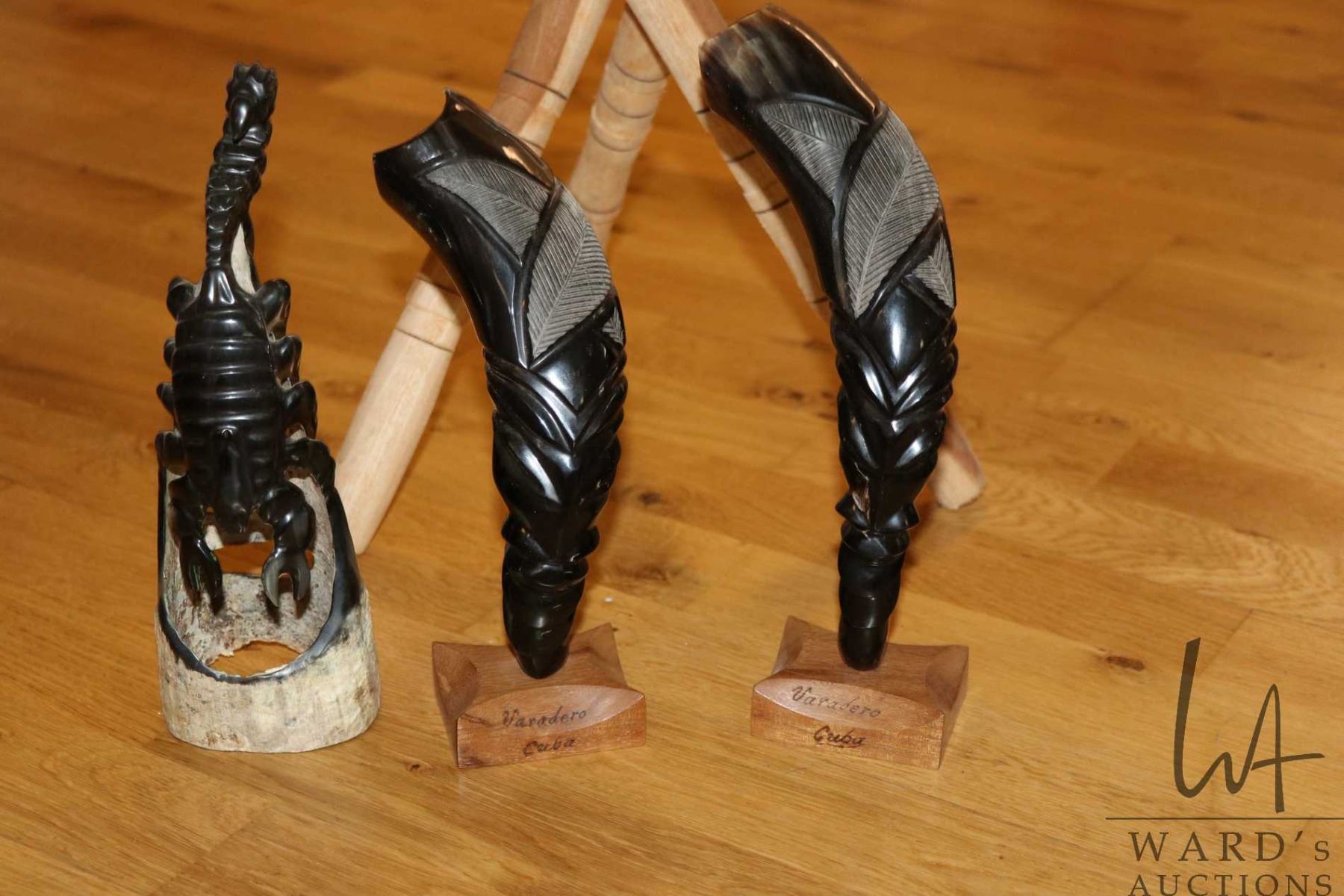 NAMAO LOCATION Folding stool with leather Cuba motif seat plus three horn carvings -Note: this is a moving auction from a clean home - Note: No live preview, These items are located in Namao and location and contact information will be given to winning bidders only. Pick up times are July 21st through July 26st by appointment with homeowner. Anything left after 4pm on July 26 will be deemed abandoned