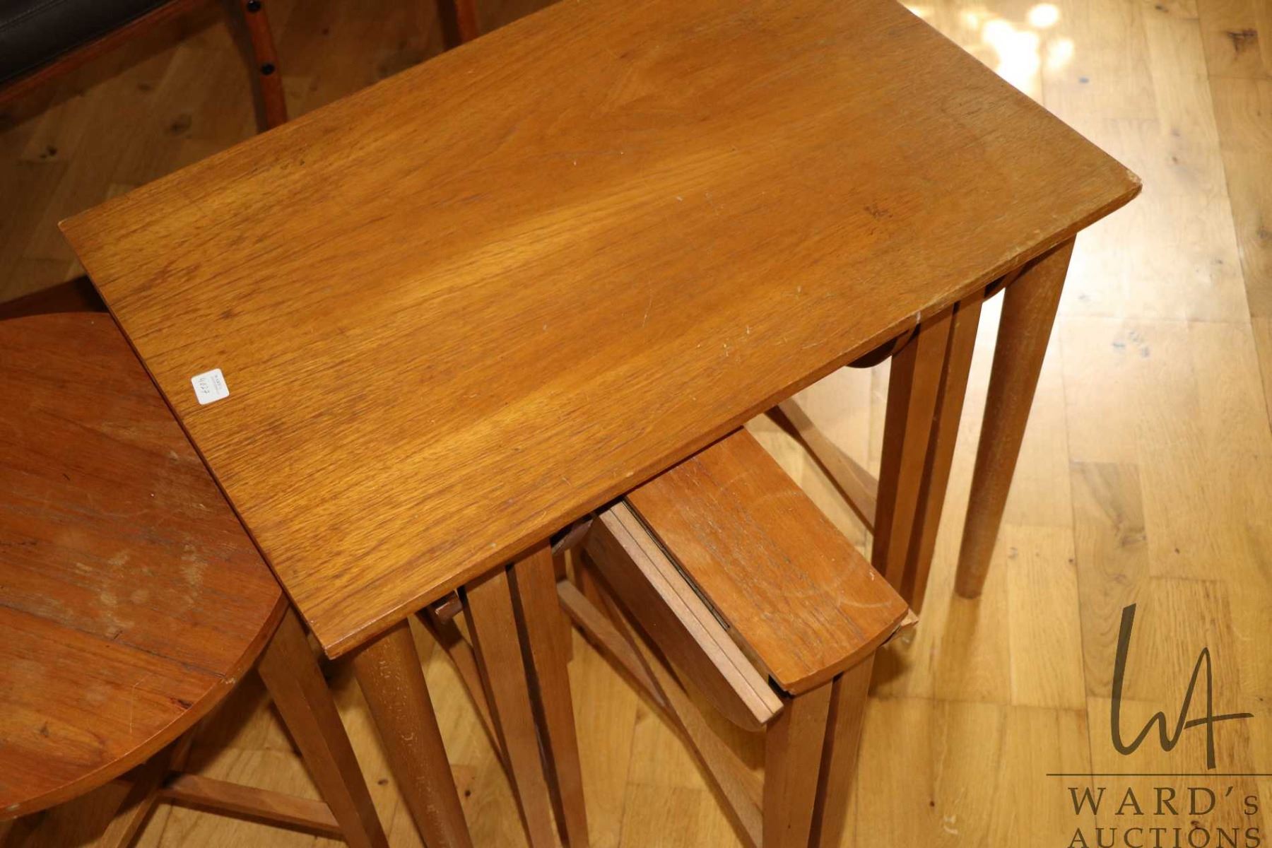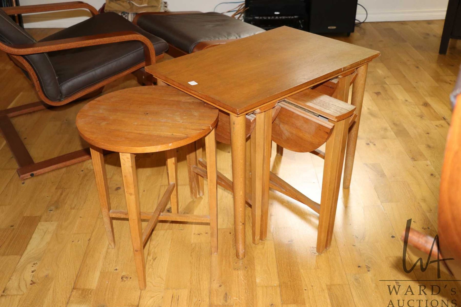 NAMAO LOCATION Mid century modern style nesting table including rectangular table 21" H X 17" X 24", that holds four folding 15" diameter folding tables -Note: this is a moving auction from a clean home - Note: No live preview, These items are located in Namao and location and contact information will be given to winning bidders only. Pick up times are July 21st through July 26st by appointment with homeowner. Anything left after 4pm on July 26 will be deemed abandoned