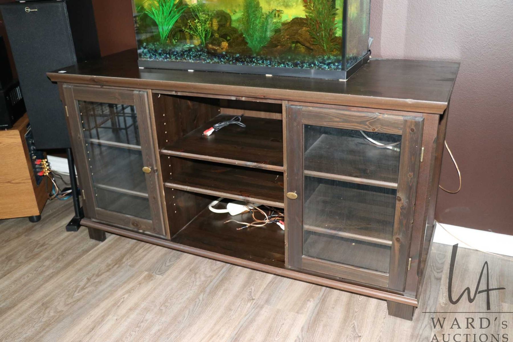 NAMAO LOCATION Pine flat screen television stand with component compartment and two doors, 29" H X 54" X 20" -Note: this is a moving auction from a clean home - Note: No live preview, These items are located in Namao and location and contact information will be given to winning bidders only. Pick up times are July 21st through July 26st by appointment with homeowner. Anything left after 4pm on July 26 will be deemed abandoned