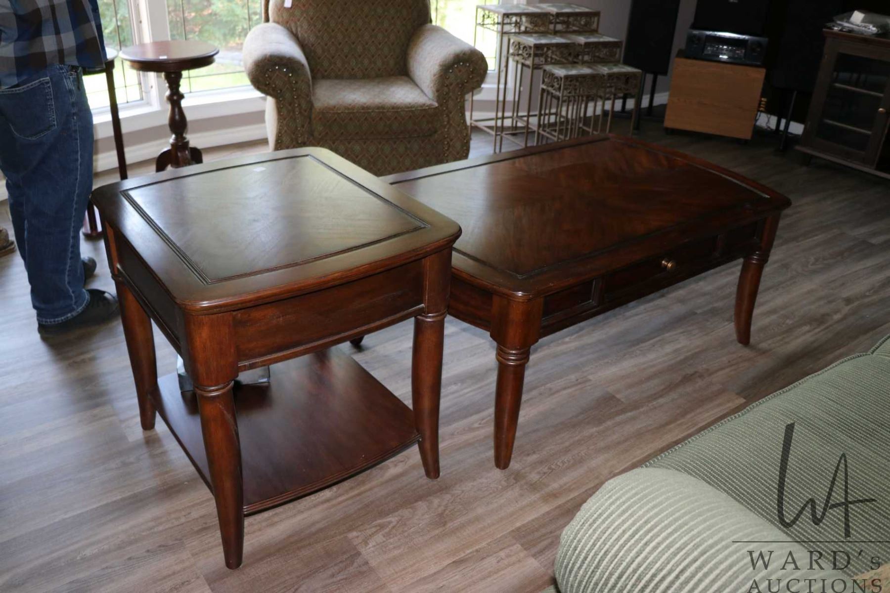 NAMAO LOCATION Single drawer coffee table, 21"H X 48" W X 30" D plus matching side table 26" X 24" X 27" note: matches lot no. 4001 -Note: this is a moving auction from a clean home - Note: No live preview, These items are located in Namao and location and contact information will be given to winning bidders only. Pick up times are July 21st through July 26st by appointment with homeowner. Anything left after 4pm on July 26 will be deemed abandoned