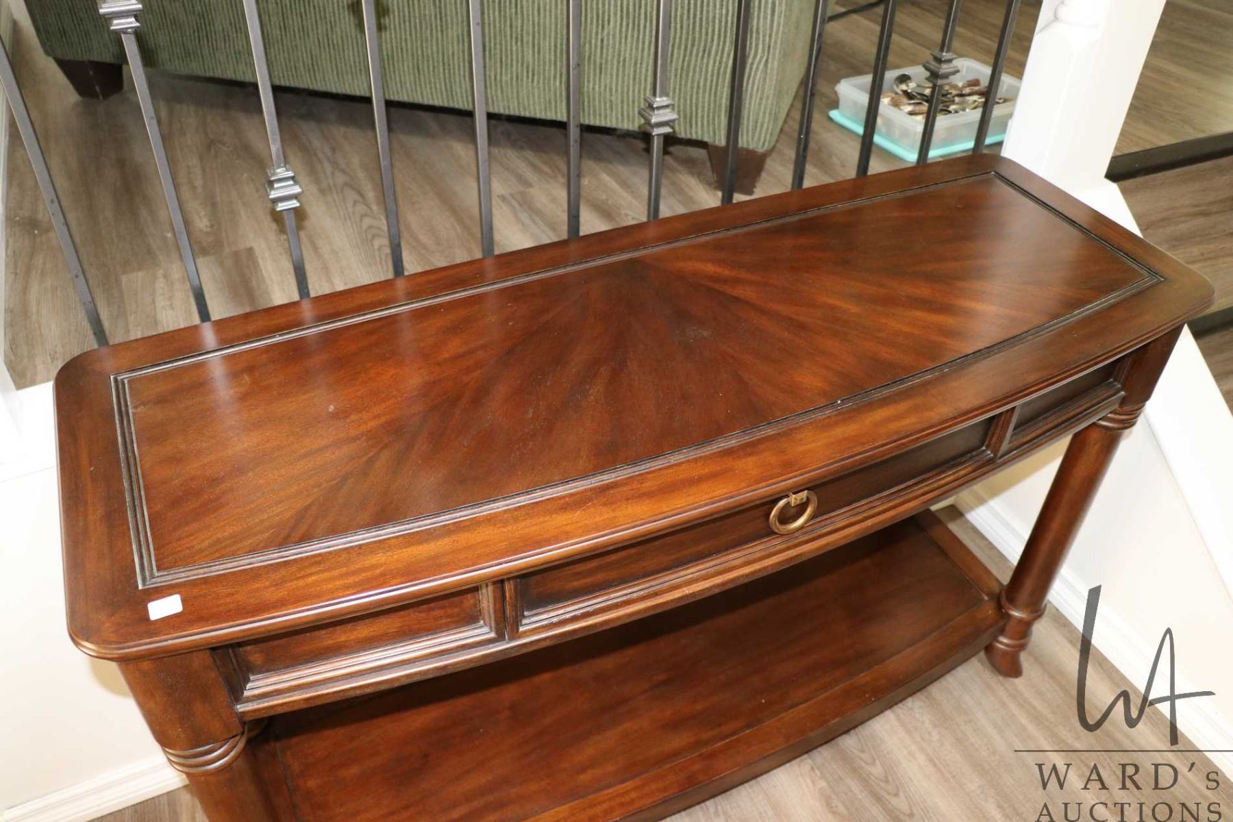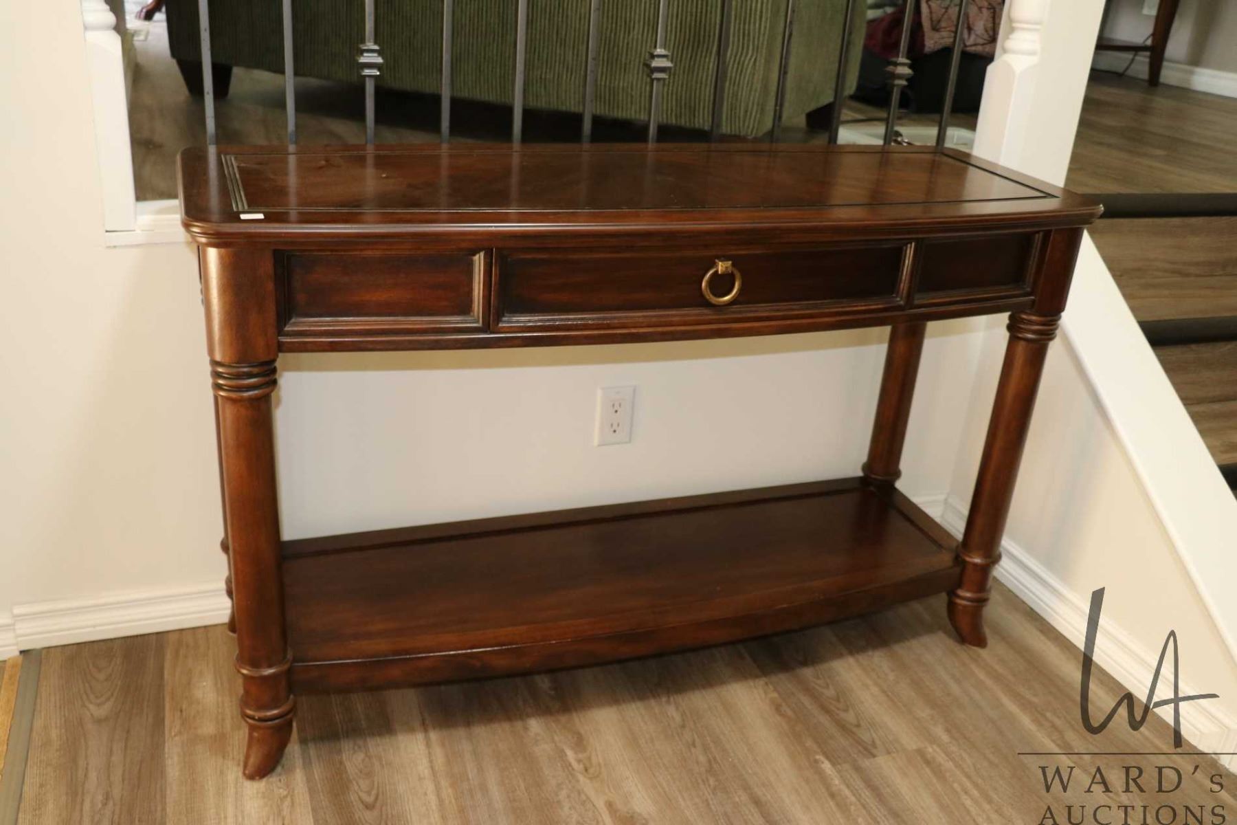 NAMAO LOCATION Single drawer console/ entry table, 32" H X 52" W X 19" D -Note: this is a moving auction from a clean home - Note: No live preview, These items are located in Namao and location and contact information will be given to winning bidders only. Pick up times are July 21st through July 26st by appointment with homeowner. Anything left after 4pm on July 26 will be deemed abandoned