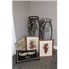 NAMAO LOCATION Two floor standing metal framed candleholders 31" H, two prints, note: one with broke