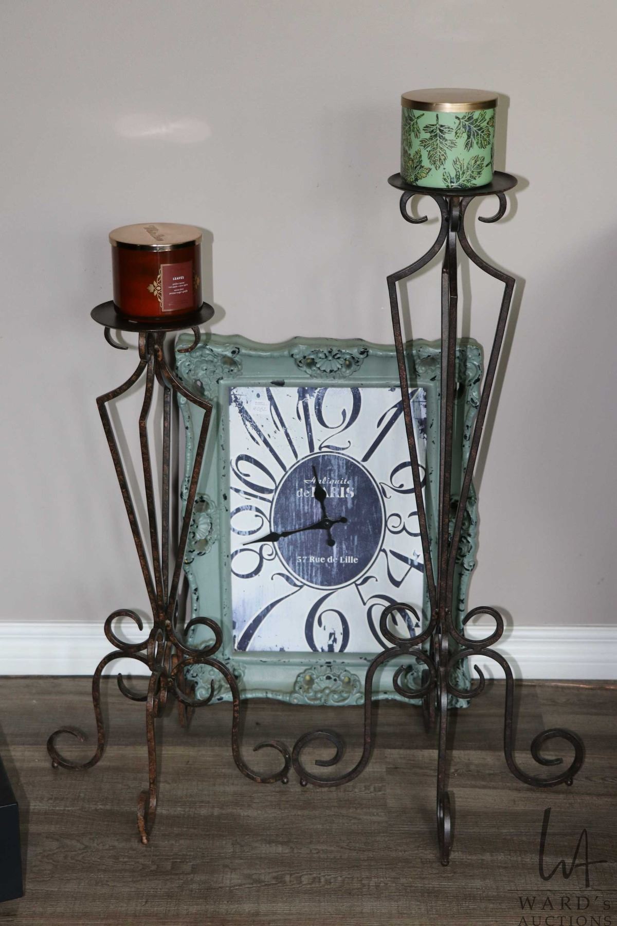 NAMAO LOCATION Two metal candleholders 24" and 30" in height plus a Paris motif clock -Note: this is a moving auction from a clean home - Note: No live preview, These items are located in Namao and location and contact information will be given to winning bidders only. Pick up times are July 21st through July 26st by appointment with homeowner. Anything left after 4pm on July 26 will be deemed abandoned