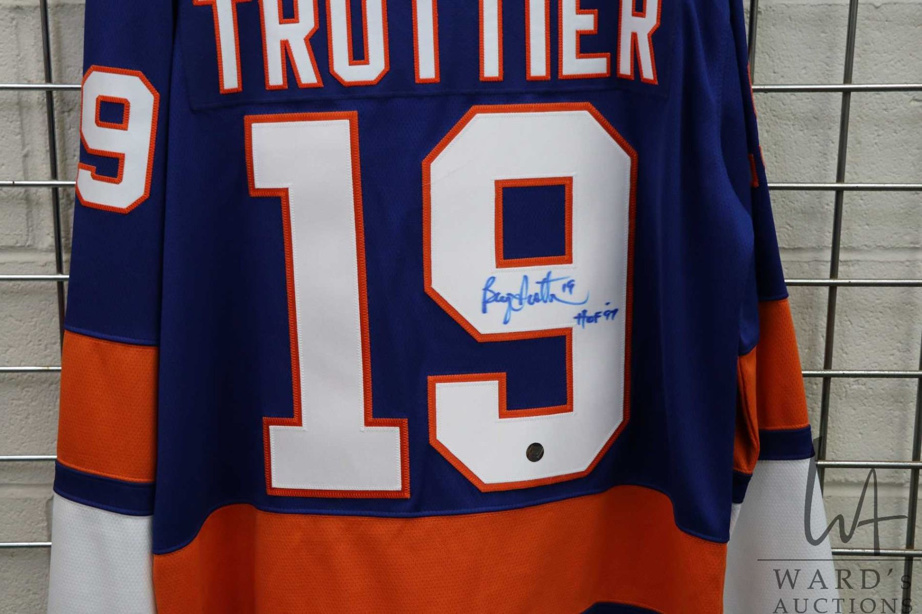NHL Fanatics New York Islanders hand signed Bryan Trottier No.4 hockey jersey. Adult size L. Includes Frozen Pond authentication sticker certification signature