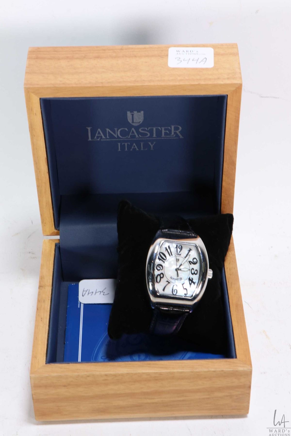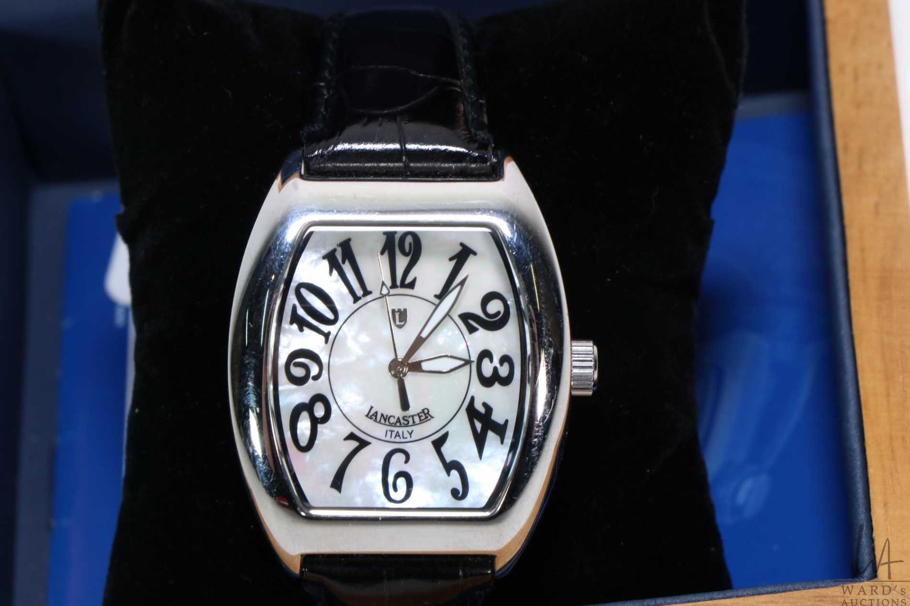 Near new Italian made Lancaster ladies wrist watch with mother of pearl like dial and original box and manual, working at time of cataloguing