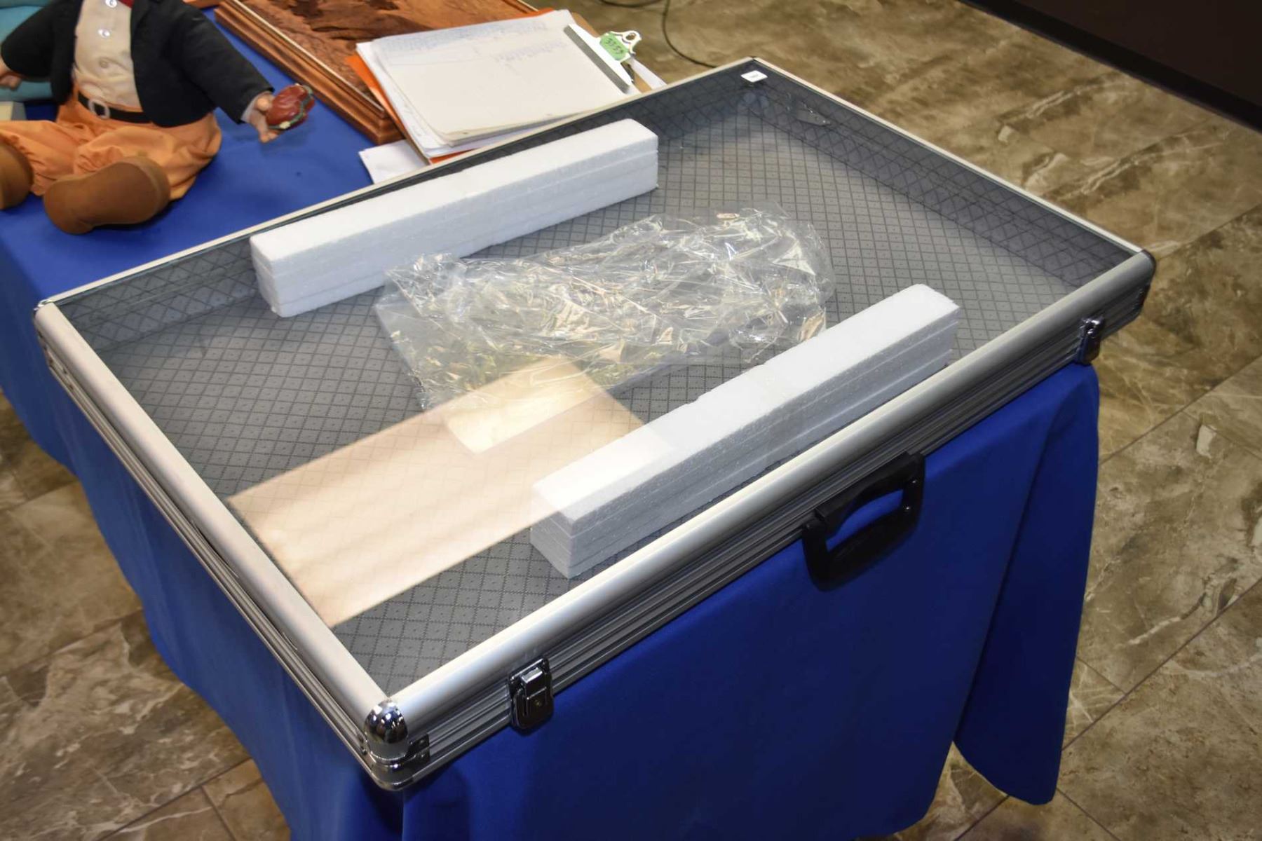 Near new aluminium and glass suitcase style counter top display case with carry handle, sans key, 22" X 34"