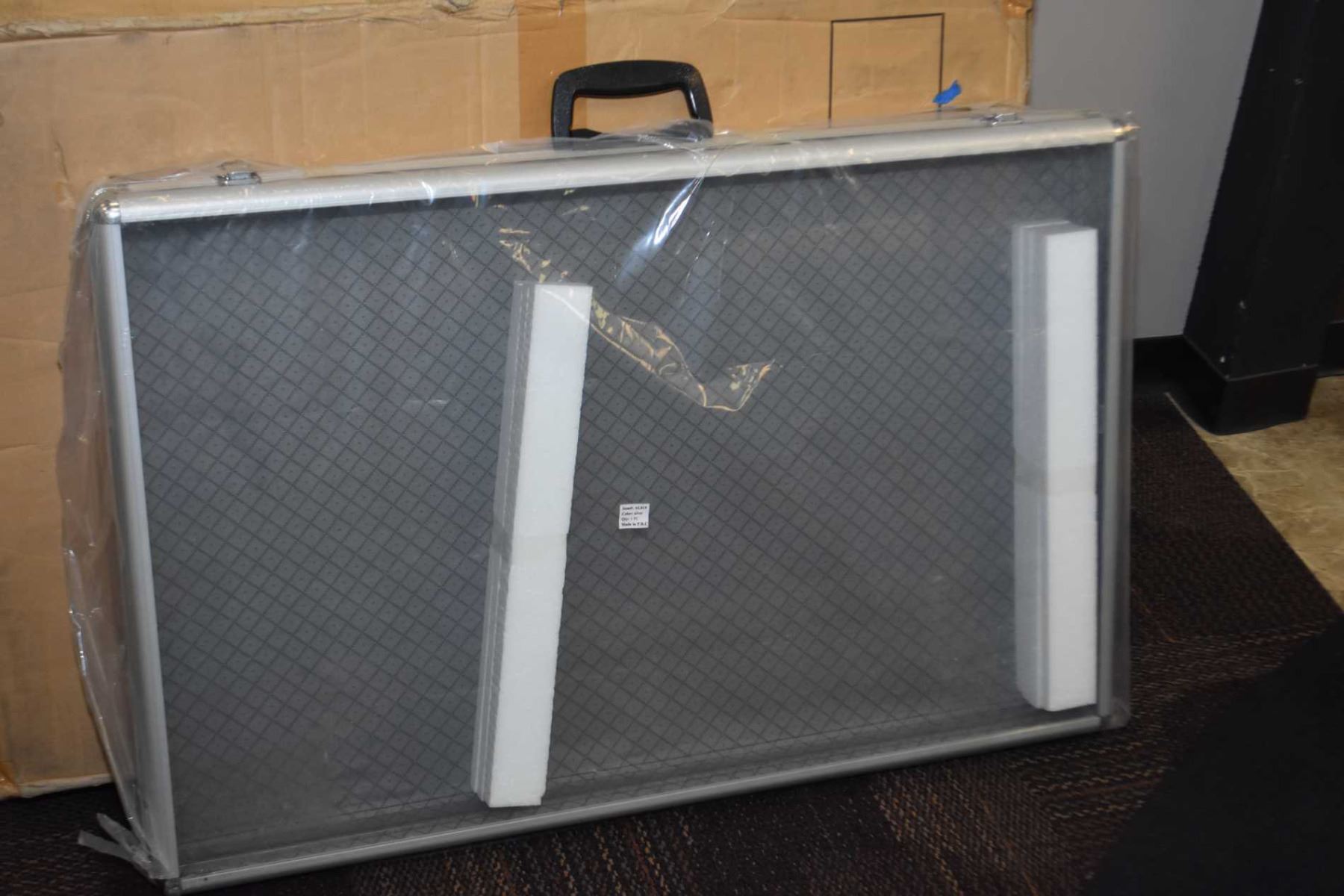 Near new aluminium and glass suitcase style counter top display case with carry handle, sans key, 22" X 34"