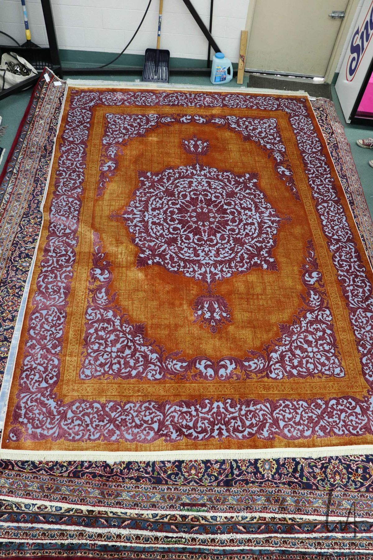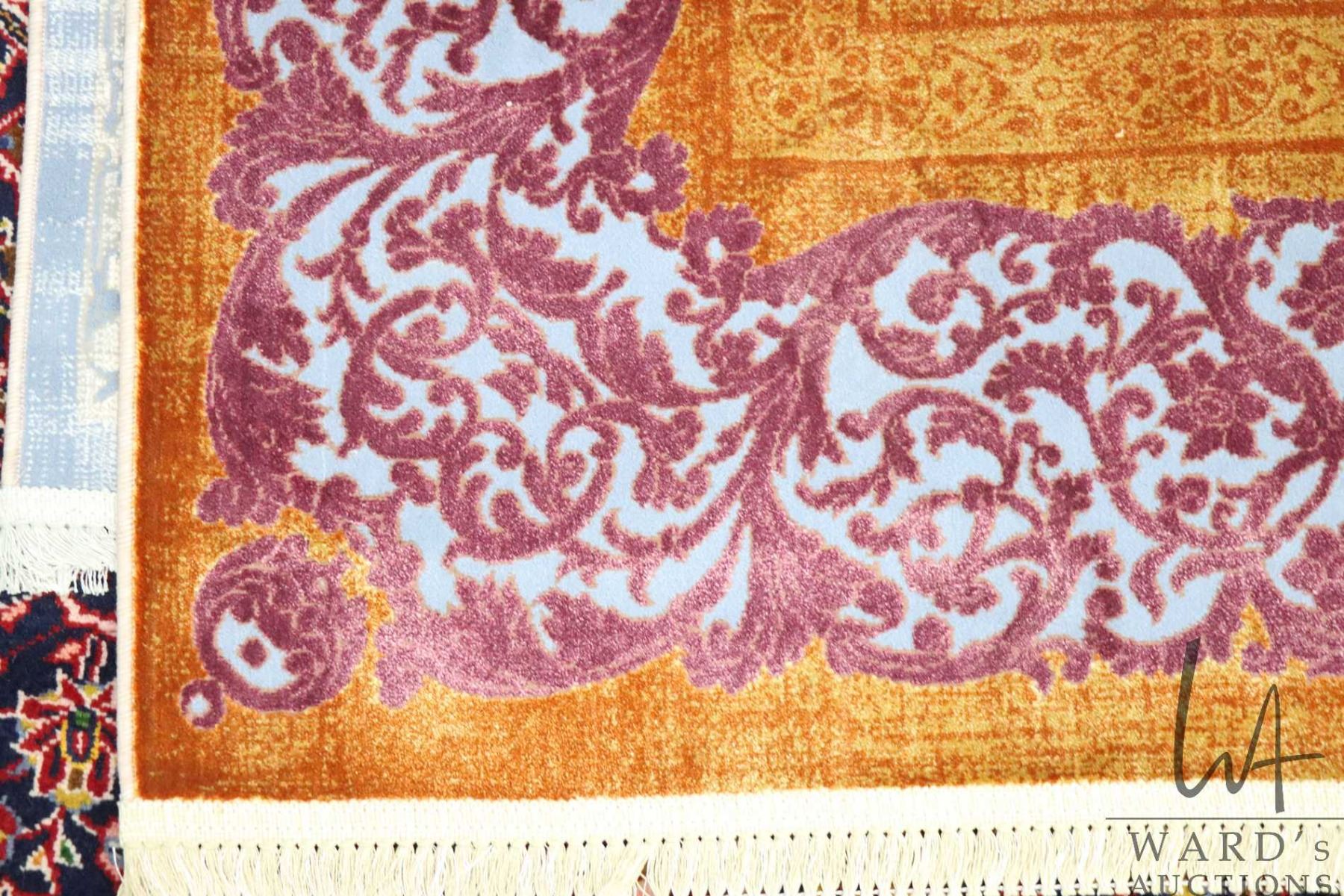 New Premium Collection Sizan blended carpet with center medallion, gold background with purple and blue highlights, 95" X 139"